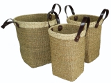3pc round seagrass storages with leather handles