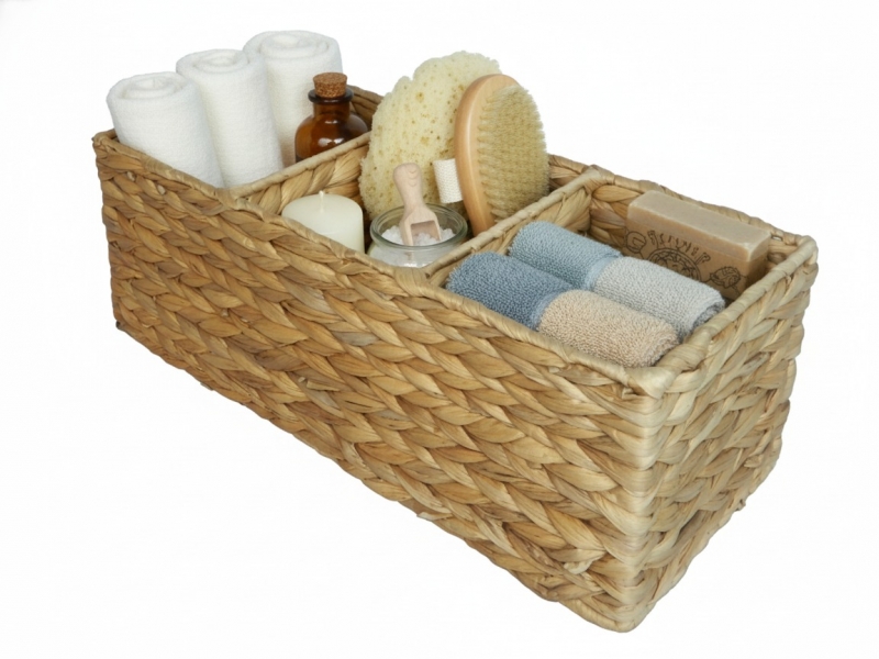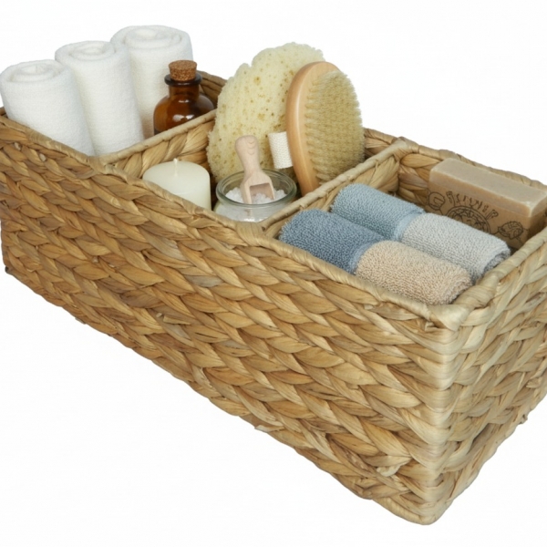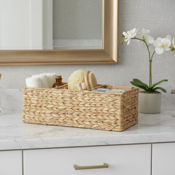 Discover the elegance of sustainable organization with this multi-compartment water hyacinth tank tray. Handwoven from natural fibers, this rectangular storage solution features three distinct sections, perfect for decluttering any space. Its warm, earthy tones and intricate braid pattern add a touch of bohemian chic and organic texture to your home decor. Ideal for a variety of uses, from kitchen utensil holder to office supply organizer or bathroom vanity tidy. This eco-friendly basket combines practical functionality with aesthetic appeal, making it a stylish and versatile accessory for modern living. Enhance your living areas with this durable and charming natural woven organizer, designed for both style and convenience.