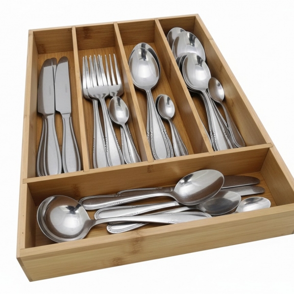 Discover this versatile and eco-friendly bamboo drawer organizer, meticulously crafted to bring order and natural elegance to any space. Featuring multiple deep compartments, this essential home accessory is perfect for neatly arranging cutlery and kitchen utensils in your kitchen drawers, or organizing stationery, craft supplies, and small accessories in your office or bedroom. Made from sustainable and durable bamboo, it showcases a beautiful light wood grain that complements various interior styles, from modern minimalist to rustic charm. Its robust construction ensures long-lasting utility, while the thoughtful design maximizes storage efficiency. This organizer is an ideal solution for decluttering drawers, enhancing accessibility, and promoting a more organized and harmonious living environment. Embrace sustainability and elevate your home organization with this stylish bamboo tray.