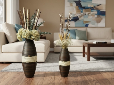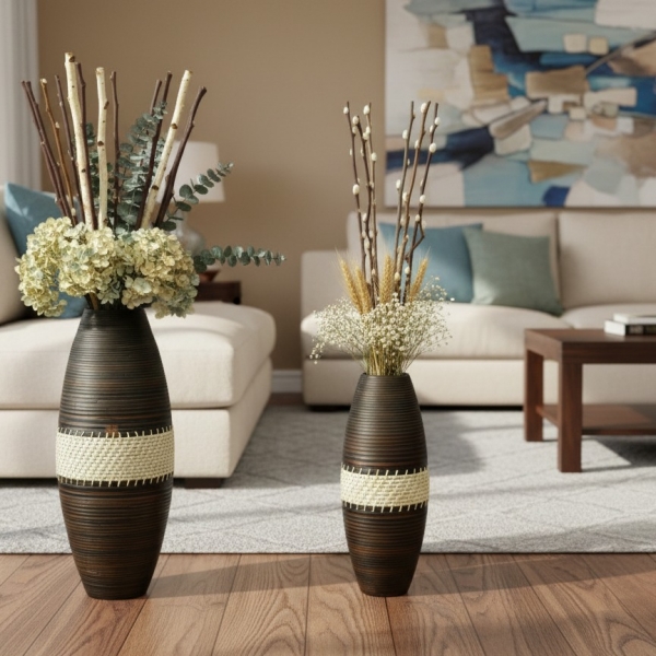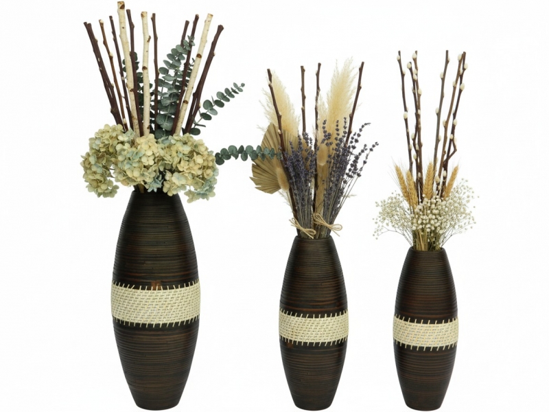 This elegant set of three decorative bamboo vases offers a sophisticated touch to any modern or rustic interior. Each vase, varying in height, is meticulously crafted from dark-stained bamboo, showcasing a unique ridged texture that adds depth and visual interest. A striking central band of light, intricately woven rattan or natural fiber beautifully contrasts with the darker body, enhancing their contemporary appeal. Perfect for adding organic charm, these versatile vases can serve as standalone statement pieces or hold dried botanicals, complementing a wide range of decor styles from minimalist to bohemian. Elevate your home or office space with these eco-friendly and stylish decorative accents.