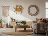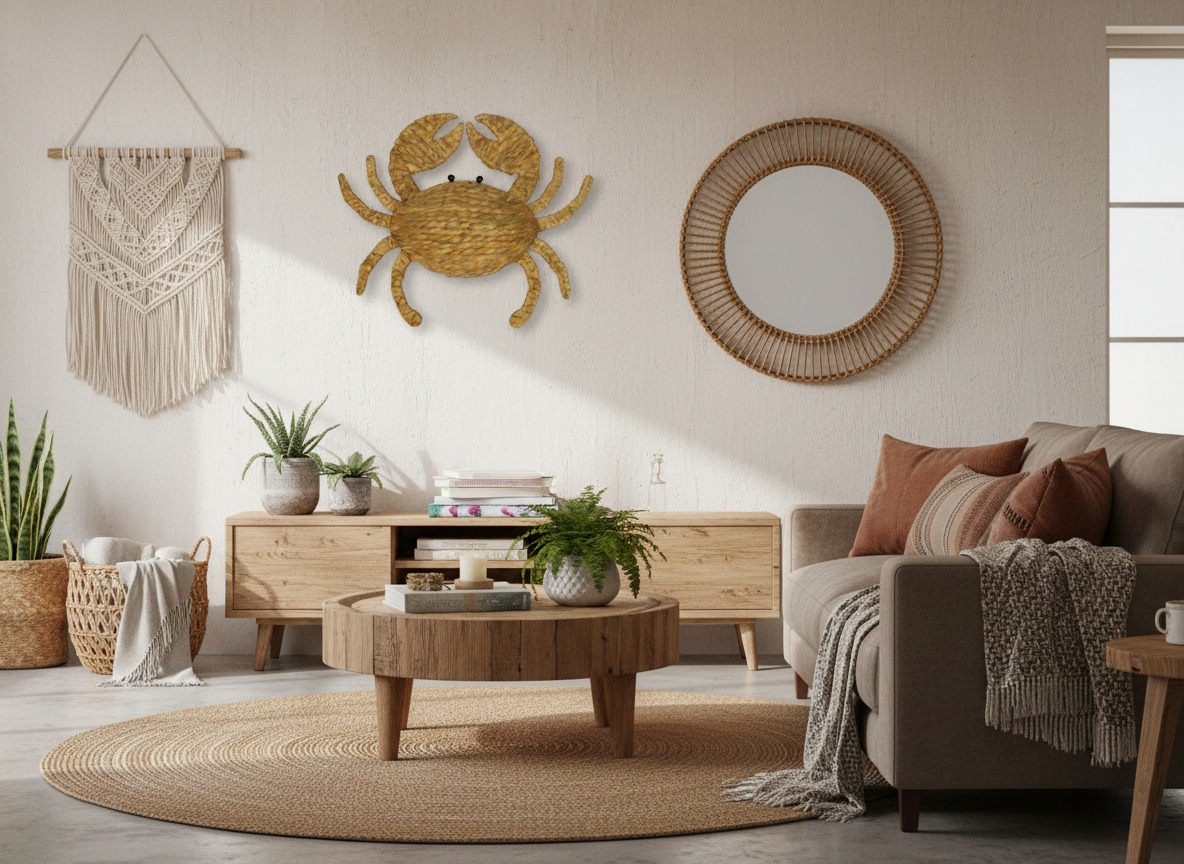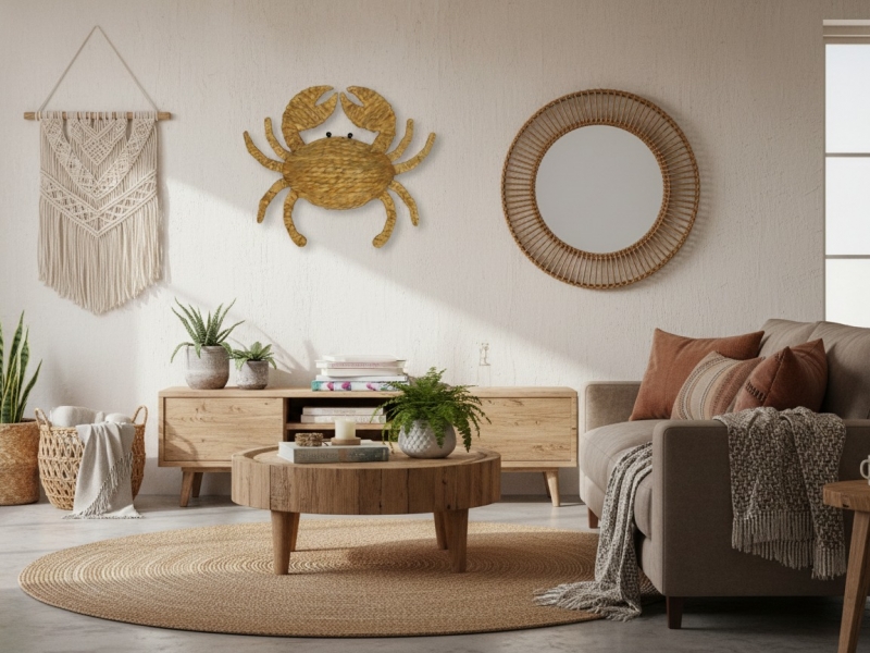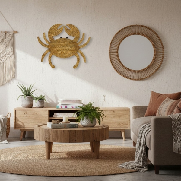 This charming, handcrafted wall decor features a delightful crab design, meticulously woven from natural plant fibers, likely water hyacinth or similar wicker material. Its rustic, earthy tones and intricate texture add a touch of coastal elegance and beachy charm to any interior. With prominent claws, legs, and distinct black eyes, this unique piece captures the essence of marine life in an artistic form. Ideal for enhancing living rooms, bathrooms, or seaside-themed bedrooms, this SEO-friendly decor item is perfect for those looking to infuse their space with a relaxed, natural aesthetic and a subtle nod to oceanic beauty. It serves as an eye-catching accent, celebrating artisanal craftsmanship and sustainable materials.