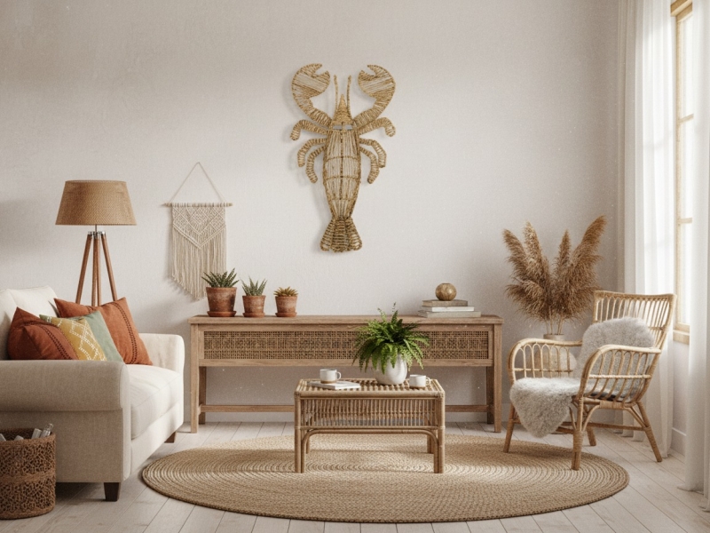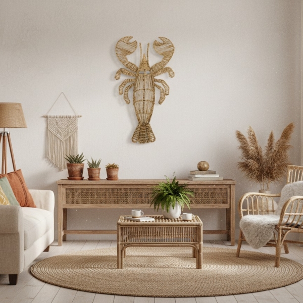 Introducing our captivating lobster-shaped wall decor, a perfect blend of rustic charm and coastal elegance. Expertly crafted from natural woven fibers like seagrass, its intricate design beautifully captures the distinct features of a lobster, including its prominent claws and segmented body. This unique piece offers a touch of the seaside to any interior, making it an ideal accent for coastal-themed homes, bohemian spaces, or even a nautical-inspired restaurant. Its natural texture and warm earthy tones enhance existing decor, providing an engaging focal point. A stylish way to bring oceanic flair and artisanal craftsmanship into your living room, dining area, or beach house.