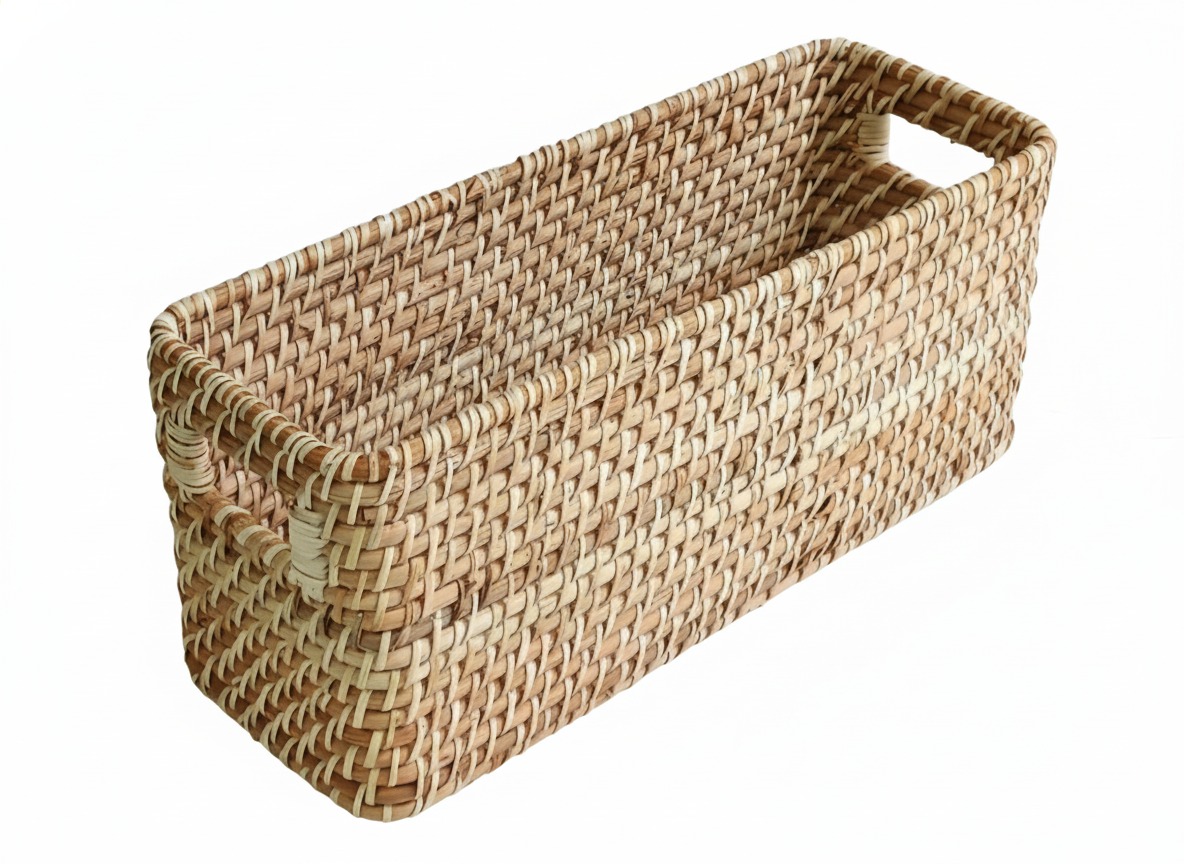 This elegantly crafted rattan storage bin offers a stylish and practical solution for home organization. Made from natural woven rattan, its sturdy rectangular design features integrated cut-out handles for easy portability. Perfect for decluttering any space, this versatile basket seamlessly blends with various interior styles, from boho chic to modern minimalist. Use it to neatly store magazines, remote controls, towels, craft supplies, or pantry essentials, adding a touch of natural texture and warmth to your living room, bedroom, bathroom, or office. Its timeless aesthetic and durable construction make it an ideal choice for enhancing both functionality and decor.