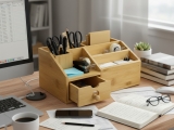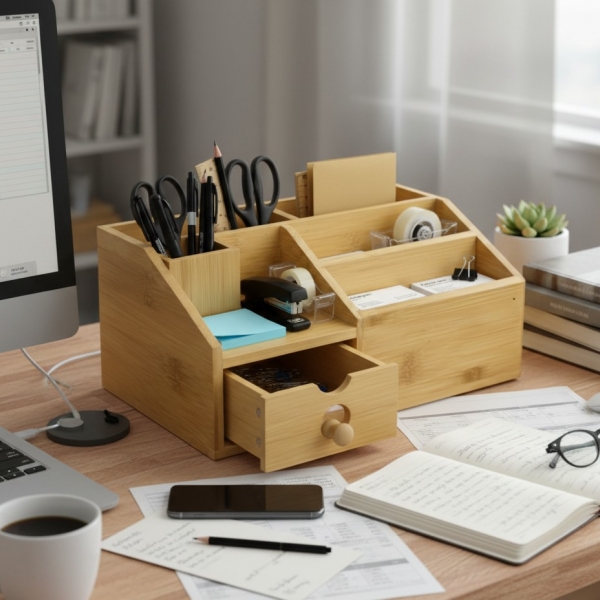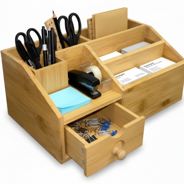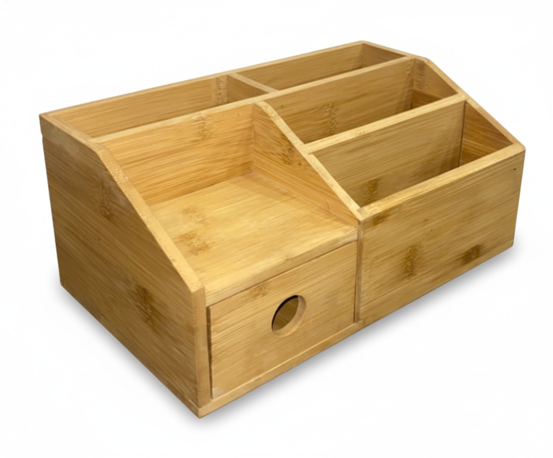This versatile bamboo desktop organizer offers a stylish and eco-friendly solution for decluttering any workspace or home area. Crafted from sustainable bamboo, its natural wood finish brings warmth and sophistication. Featuring multiple compartments of varying sizes, it's perfectly designed to hold office supplies like pens, pencils, sticky notes, and paper clips, keeping them neatly arranged and easily accessible. A convenient pull-out drawer provides discreet storage for smaller essentials or personal items, maintaining a tidy appearance. Ideal for enhancing productivity in a home office, study, or even a kitchen, this durable and compact organizer seamlessly blends functionality with minimalist design, making it a must-have for modern living and efficient organization.