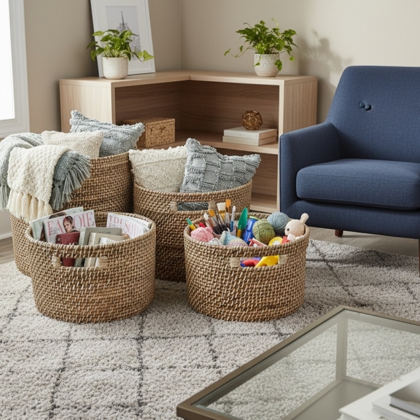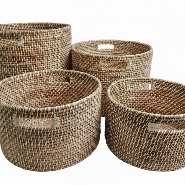 Discover this exquisite set of four rattan storage baskets, showcasing a beautiful natural woven design. Each basket, varying in size, features sturdy, integrated handles for easy carrying and relocation. The unique two-tone weave, combining light brown and beige hues, adds a touch of bohemian elegance and rustic charm to any interior. Perfect for decluttering and organizing various spaces, these versatile baskets seamlessly blend functionality with aesthetic appeal. Use them to store blankets, toys, magazines, or laundry, enhancing your home's decor with their organic texture and artisanal craftsmanship. Ideal for both contemporary and traditional settings, these durable rattan baskets offer a stylish solution for everyday storage needs, elevating your home organization game.