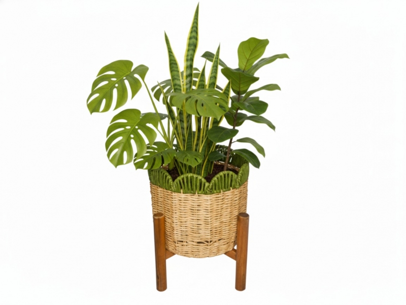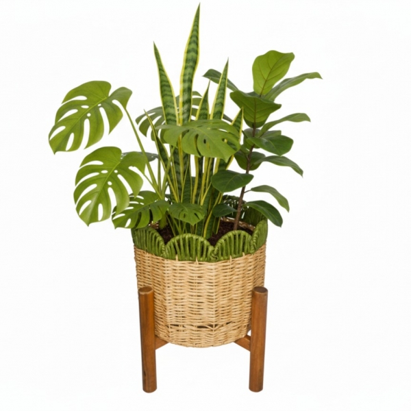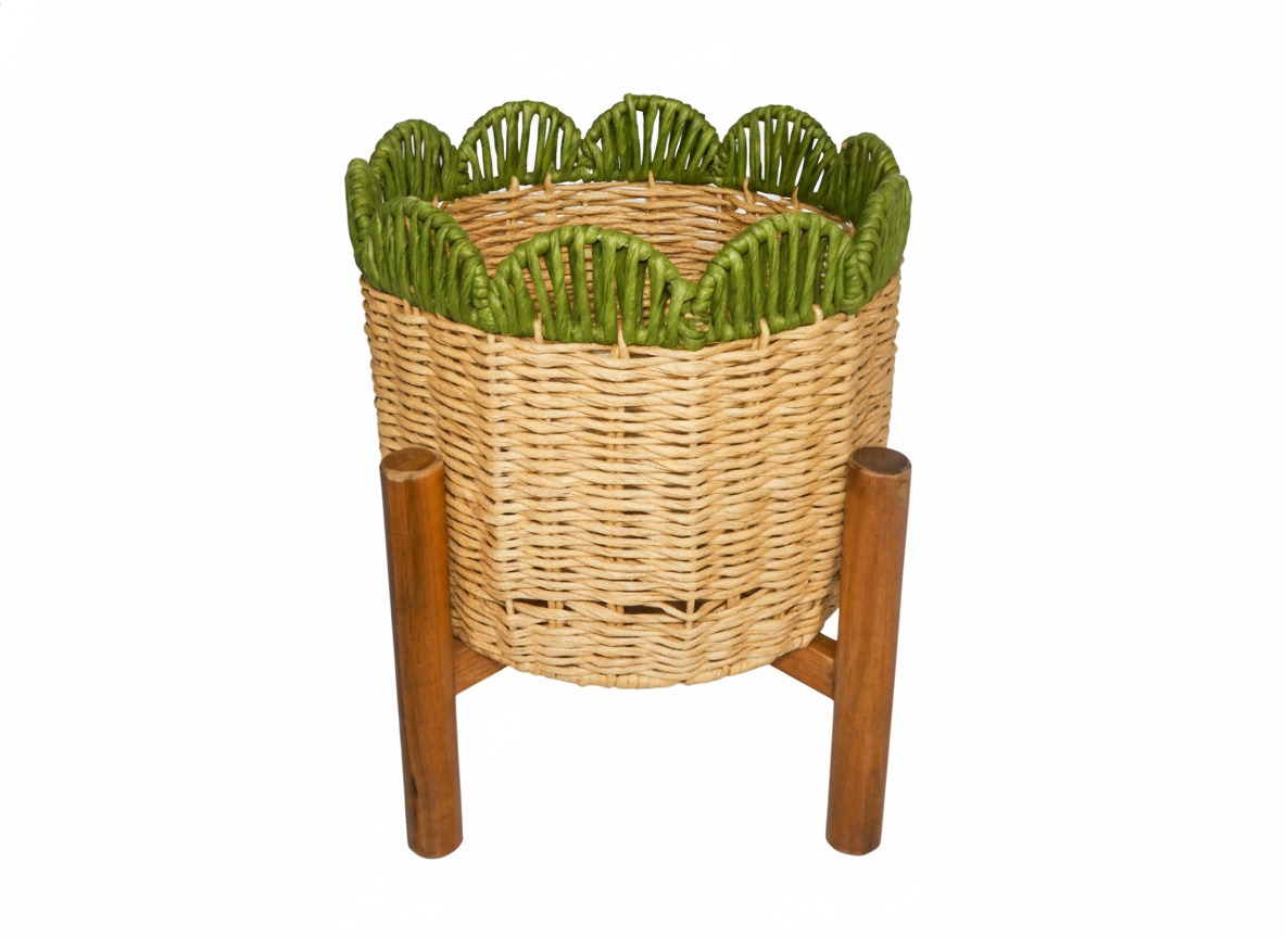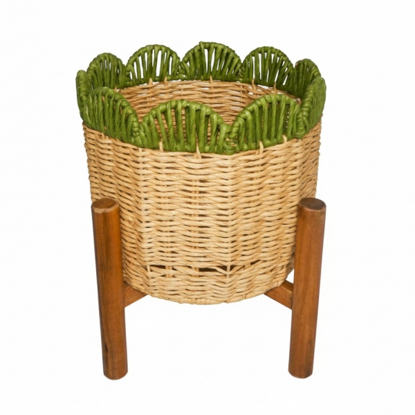 Discover this charming paper rope planter, designed to infuse natural elegance into any indoor space. Featuring a sturdy, handcrafted natural woven base elevated on sleek wooden legs, this planter boasts a distinctive green scalloped rim that adds a playful yet sophisticated touch. Its boho-chic aesthetic makes it a versatile decor piece, perfect for showcasing your favorite plants or storing household essentials. Ideal for modern, bohemian, or eclectic interiors, this elevated basket-style planter combines functionality with artisanal craftsmanship, enhancing living rooms, bedrooms, or entryways with its unique texture and organic appeal. A stylish choice for sustainable home decor.