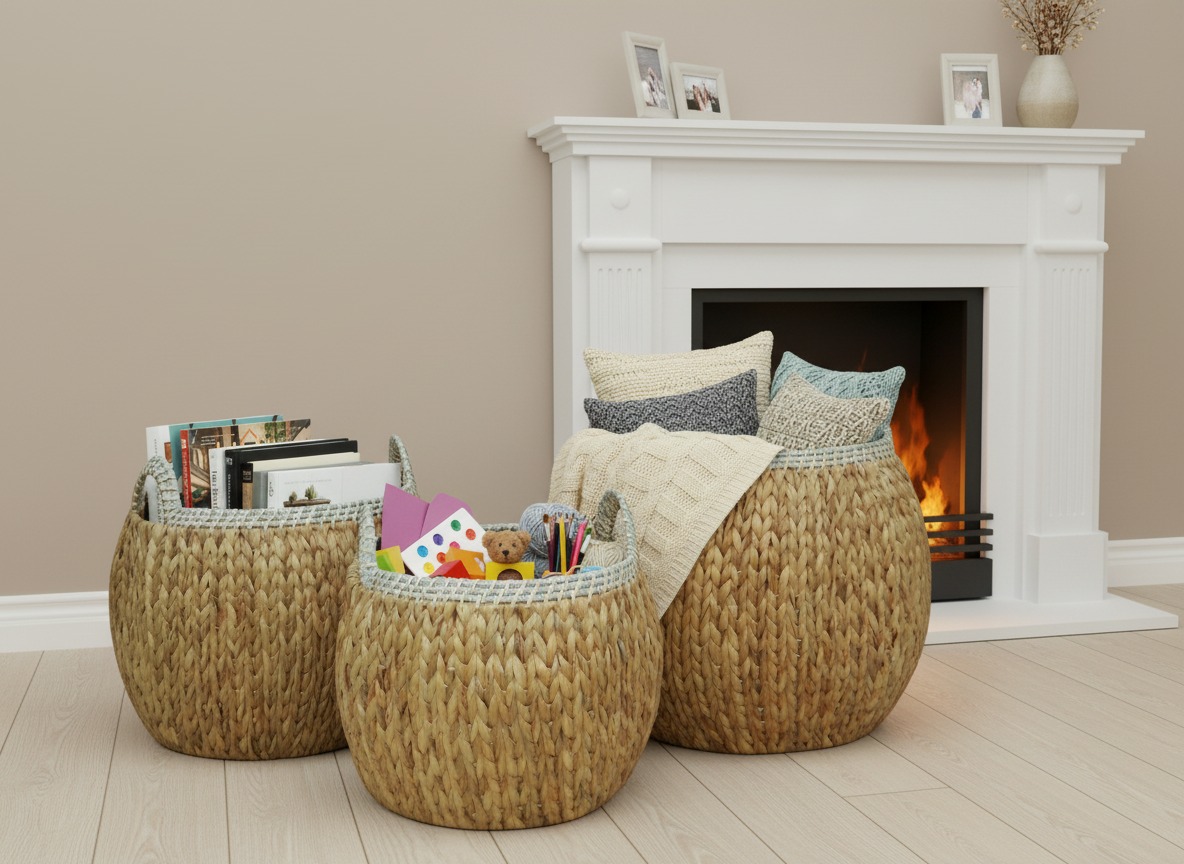 This elegant set of three water hyacinth baskets showcases exquisite natural craftsmanship, offering both functional storage and sophisticated decorative appeal. Each basket features a rich, textured weave and robust integrated handles, making them easy to move. A distinctive light-colored rope rim adds a subtle, refined contrast and reinforces the opening, enhancing their coastal or bohemian charm. Their varying sizes provide versatile solutions for decluttering any room, from neatly tucking away throw blankets and pillows in a living area to organizing toys in a child's bedroom or holding magazines in an entryway. These durable, handcrafted pieces are perfect for infusing warmth and an organic, eco-friendly aesthetic into modern or traditional interiors, elevating your home organization with natural elegance.