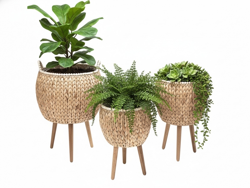 Enhance your interior space with this charming set of three water hyacinth planters, featuring elegant wooden legs and delicate wooden bead detailing around the rim. These natural-toned, hand-woven baskets offer a perfect blend of bohemian and modern rustic styles, making them versatile additions to any home decor. Designed for indoor use, these sturdy plant stands provide an elevated home for your favorite greenery, from lush houseplants to vibrant floral arrangements. The varying sizes allow for a dynamic display, bringing warmth and organic texture to living rooms, bedrooms, or sunrooms. Ideal for adding a touch of natural elegance and functionality, these planters are a must-have for eco-conscious decorators seeking stylish and sustainable home accents.
