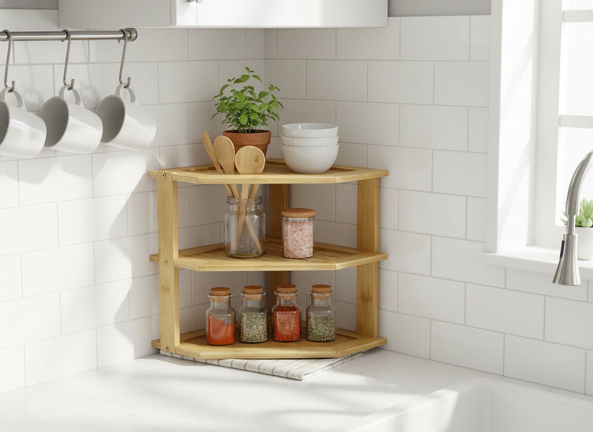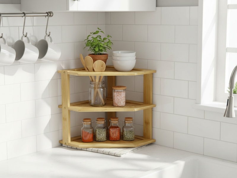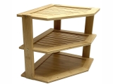 This elegant three-tier bamboo corner shelf unit offers a practical and stylish solution for optimizing space in any room. Crafted from durable, light-toned bamboo, its natural wood grain provides a warm, inviting aesthetic that complements various interior designs, from modern minimalist to rustic farmhouse. The unique triangular design is specifically engineered to fit snugly into corners, transforming often-unused areas into valuable storage or display zones. Featuring two slatted shelves perfect for ventilation and a solid bottom shelf for added stability, this versatile organizer is ideal for bathrooms to hold toiletries, towels, or plants. It can also enhance kitchen countertops for spices or small appliances, or add functional decor to a living room for displaying books, small decor pieces, or collectables. Easy to assemble and maintain, this freestanding shelf unit is a sustainable choice for decluttering and beautifying your home.