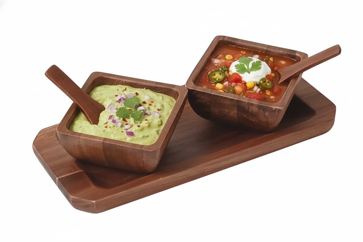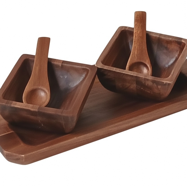 This elegant two-piece wooden serving set, presented on a matching rectangular tray, offers a perfect blend of rustic charm and functional design for any home. Crafted from rich, dark-grained wood, possibly acacia or teak, the set features two square-shaped bowls, each accompanied by its own small, perfectly sized wooden spoon. The warm tones and natural textures of the wood make it a versatile addition to various decor styles, from modern minimalist to bohemian chic. Ideal for entertaining, this stylish condiment holder is perfect for serving an array of dips, sauces, spices, nuts, olives, or small appetizers. Its compact design ensures it fits beautifully on any table, kitchen counter, or dining spread, making it a thoughtful gift or a sophisticated upgrade to your own kitchenware collection. Enhance your dining experience with this beautifully crafted, durable wooden serveware.