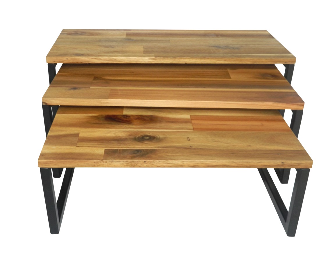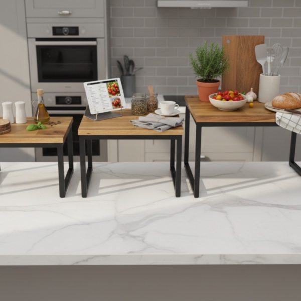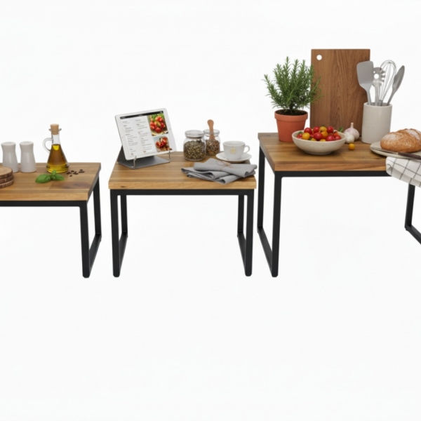 Elevate your home's aesthetic with this stunning 3-piece acacia wood kitchen shelf set, featuring robust black metal frames that exude a modern industrial charm. Each shelf boasts a beautifully variegated acacia wood surface, known for its durability and rich grain patterns, making every piece unique. This versatile nesting design allows for flexible arrangement, whether used together as a tiered display or individually as accent tables or compact storage solutions. Perfect for organizing spices, cookbooks, small appliances, or displaying decorative items in the kitchen, living room, or entryway. Its sleek lines and mixed-material construction offer a contemporary touch that complements various interior styles, from farmhouse to urban loft. A functional yet stylish addition, these shelves provide ample space while maintaining a minimalist footprint.