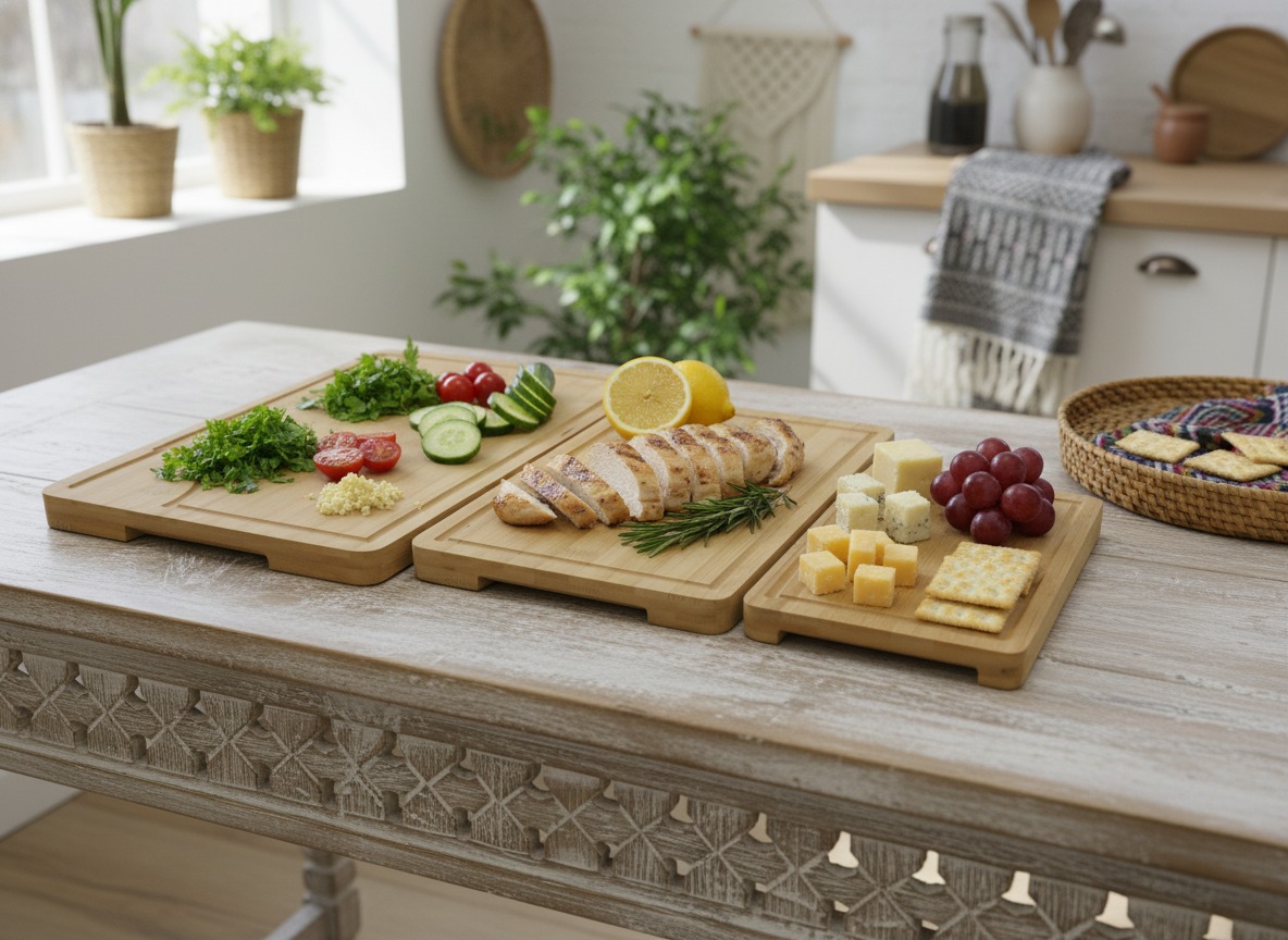 Being excited with this versatile 3-piece bamboo cutting board set, perfect for any modern kitchen. Crafted from sustainable and durable bamboo, these chopping boards offer a natural, eco-friendly solution for all your food preparation needs. The set includes three different sizes, providing ample space for slicing vegetables, dicing meats, or serving appetizers with style. Each board features a practical juice groove to prevent spills and maintain a clean countertop. Ideal for both everyday cooking and special occasions, these lightweight yet robust cutting boards are a must-have for home chefs and culinary enthusiasts. Elevate your kitchen aesthetic while embracing functionality and sustainability with this elegant bamboo board collection. Easy to clean and maintain, they are designed for longevity and reliable performance.
