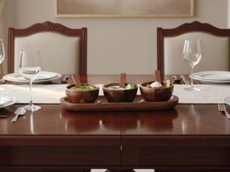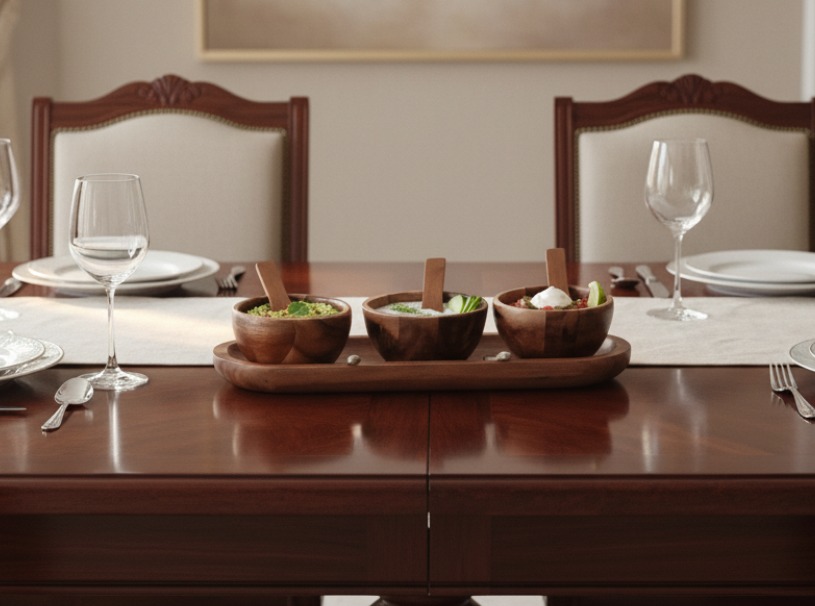This elegant two-piece wooden serving set, presented on a matching rectangular tray, offers a perfect blend of rustic charm and functional design for any home. Crafted from rich, dark-grained wood, possibly acacia or teak, the set features two square-shaped bowls, each accompanied by its own small, perfectly sized wooden spoon. The warm tones and natural textures of the wood make it a versatile addition to various decor styles, from modern minimalist to bohemian chic. Ideal for entertaining, this stylish condiment holder is perfect for serving an array of dips, sauces, spices, nuts, olives, or small appetizers. Its compact design ensures it fits beautifully on any table, kitchen counter, or dining spread, making it a thoughtful gift or a sophisticated upgrade to your own kitchenware collection. Enhance your dining experience with this beautifully crafted, durable wooden serveware.