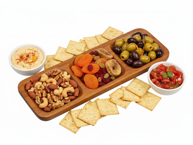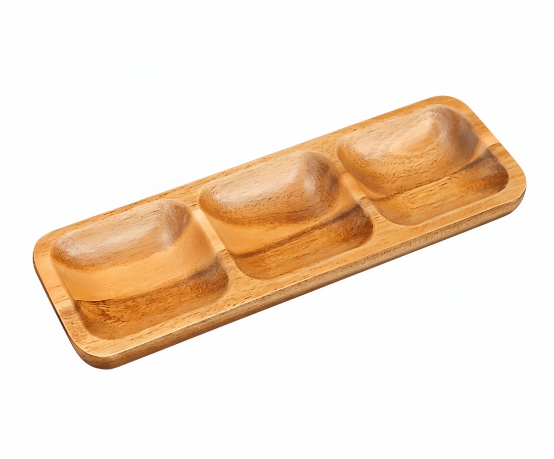 This elegant rectangular wooden snack platter features three distinct compartments crafted from rich, natural wood. Perfect for organizing and presenting a variety of snacks, appetizers, or condiments, this versatile piece adds a touch of rustic charm and sophistication to any table setting. Its smooth finish and ergonomic design make it both practical and aesthetically pleasing, ideal for entertaining guests or everyday use. The durable wood construction ensures longevity, while the multiple sections allow for neat separation of different food items. Enhance your dining experience or home decor with this stylish and functional wooden divider tray, a must-have for modern living and sustainable entertaining.