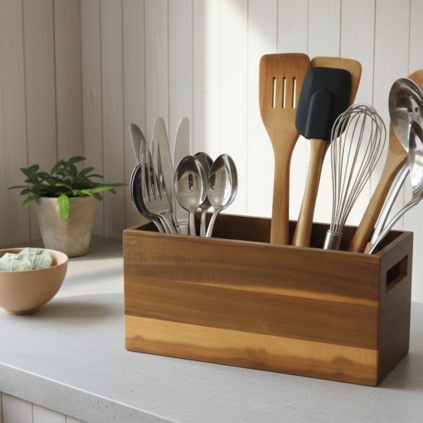 Discover this versatile wooden kitchen organizer, meticulously crafted from beautiful natural wood with varying grain patterns that add a rustic yet modern touch to any space. Featuring three generously sized compartments, it's perfect for neatly storing cutlery, kitchen utensils, napkins, or spices, keeping your countertops clutter-free. The integrated cutout handles on both sides ensure easy portability, allowing you to move it effortlessly from kitchen to dining area, or even for outdoor entertaining. Ideal for enhancing home decor, this durable and stylish caddy brings both functionality and aesthetic appeal to your home. Its compact design makes it a practical solution for maximizing storage in smaller kitchens or dining rooms, promoting an organized living environment. A must-have for those seeking stylish organizational tools.