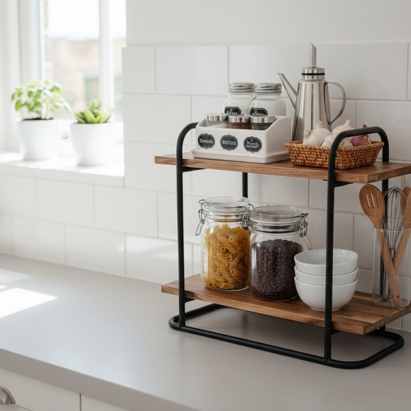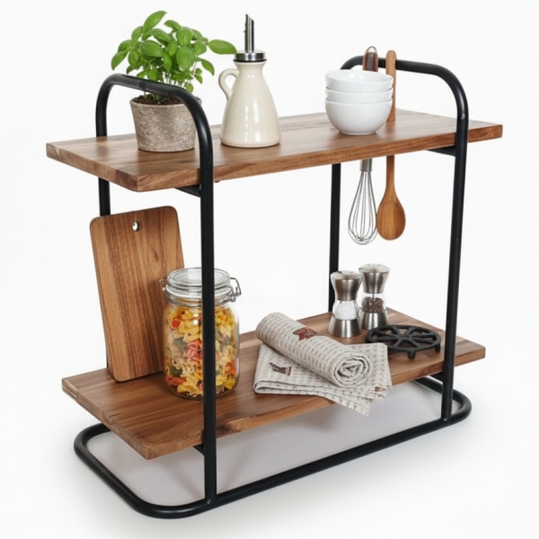 Introduce this elegant two-tier acacia wood kitchen helper, a versatile and stylish storage solution for any modern home. Crafted with rich, natural acacia wood shelves and a sleek black metal frame, this compact organizer seamlessly blends industrial charm with organic warmth. Ideal for decluttering countertops or adding functional decor, its sturdy design is perfect for displaying spices, holding small appliances, or organizing pantry essentials. The minimalist aesthetic makes it suitable for various interior styles, from contemporary to rustic farmhouse. Elevate your kitchen's functionality and visual appeal with this beautifully designed and durable acacia wood organizer, perfect for adding a touch of sophisticated utility.
