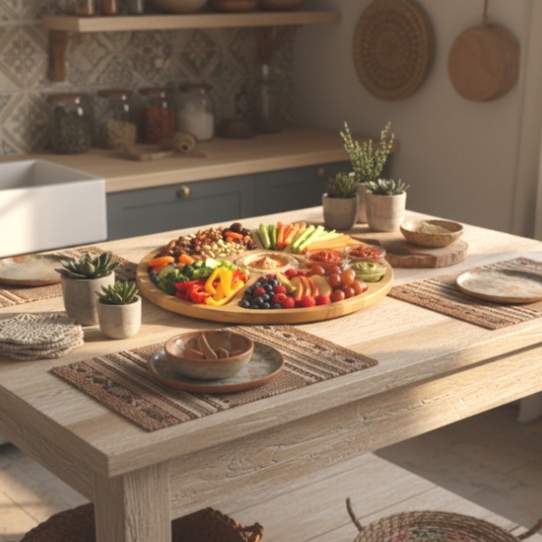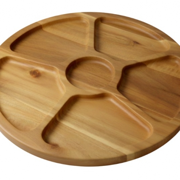 Elevate your dining experience with the sophistication of this stunning round acacia wood serving platter. Featuring a segmented design with five outer compartments and a central dip holder, this versatile tray is perfect for showcasing an array of appetizers, charcuterie, snacks, or desserts. The natural variations in the acacia wood grain provide a warm, inviting aesthetic, making each piece uniquely beautiful. Ideal for dinner parties, casual gatherings, or everyday use, this durable and stylish platter effortlessly combines functionality with sophisticated design. Elevate your culinary presentations and impress your guests with this eco-friendly and timeless kitchen essential, perfect for modern homes seeking sustainable and chic serveware.