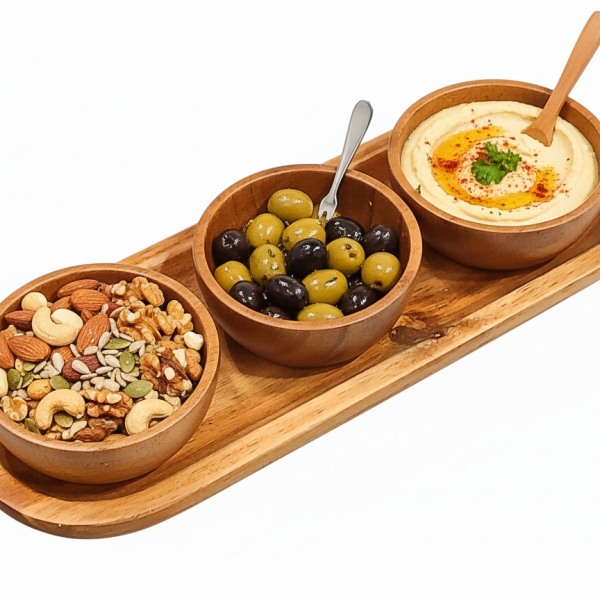 Discover the elegance of this beautifully crafted wooden serving tray, featuring three integrated bowls perfect for entertaining or everyday use. Made from rich, natural wood, possibly acacia, this versatile piece showcases unique grain patterns and a warm, inviting tone that complements any decor style, from modern farmhouse to minimalist. Ideal for serving a variety of appetizers, dips, nuts, olives, or condiments, it brings a touch of rustic charm and sophistication to your dining table, coffee table, or buffet spread. Its compact and practical design ensures easy handling and storage, making it a must-have for hosts who appreciate both functionality and aesthetic appeal. Elevate your culinary presentations and impress your guests with this eco-friendly and stylish serving solution.