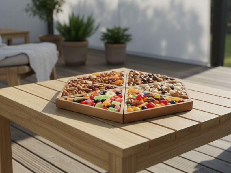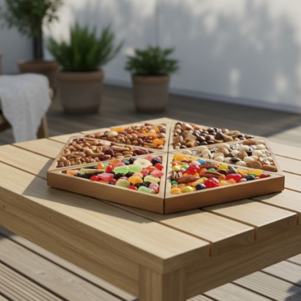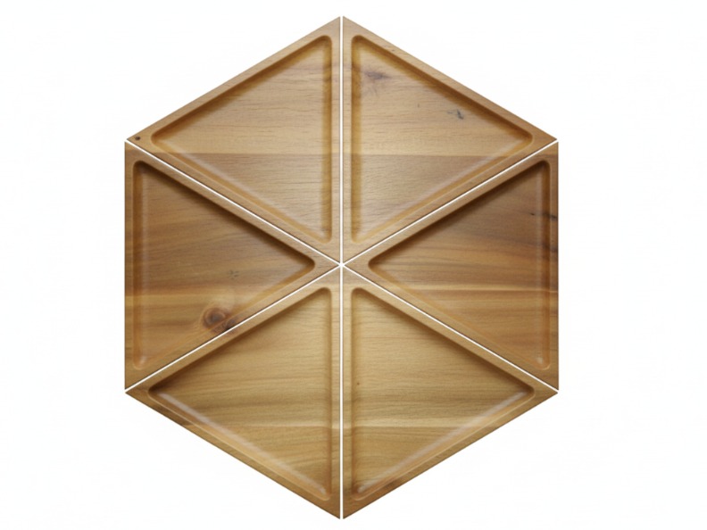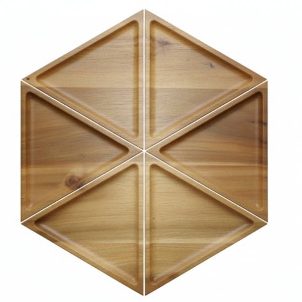 This unique hexagonal wooden serving tray brings modern elegance to any setting. Crafted from beautiful acacia wood, it features six triangular compartments, perfect for organizing and presenting a variety of snacks, appetizers, or decorative items. The natural wood grain and warm tones offer a rustic yet contemporary appeal, complementing diverse interior styles from minimalist to farmhouse chic. Ideal for entertaining guests or simply adding a touch of sophisticated organization to your home, this versatile tray is both functional and visually striking. Its modular design allows for creative food presentation, making it a standout piece for gatherings, parties, or everyday use.