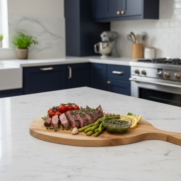 This elegant light wooden serving board, perfect for displaying appetizers or as a versatile kitchen essential, features a unique, organic shape and a convenient handle with a hanging hole. Crafted from durable natural wood, its smooth surface and visible grain add a touch of rustic charm to any kitchen or dining setting. Ideal for charcuterie, cheeses, fruits, or freshly baked bread, this multi-functional board doubles as a stylish cutting surface. Its contemporary design seamlessly blends with various home decors, from modern farmhouse to minimalist. Enhance your entertaining experience or elevate your everyday meal preparation with this aesthetically pleasing and practical display board, designed for both functionality and visual appeal.