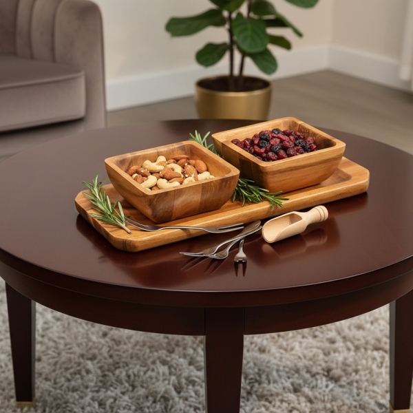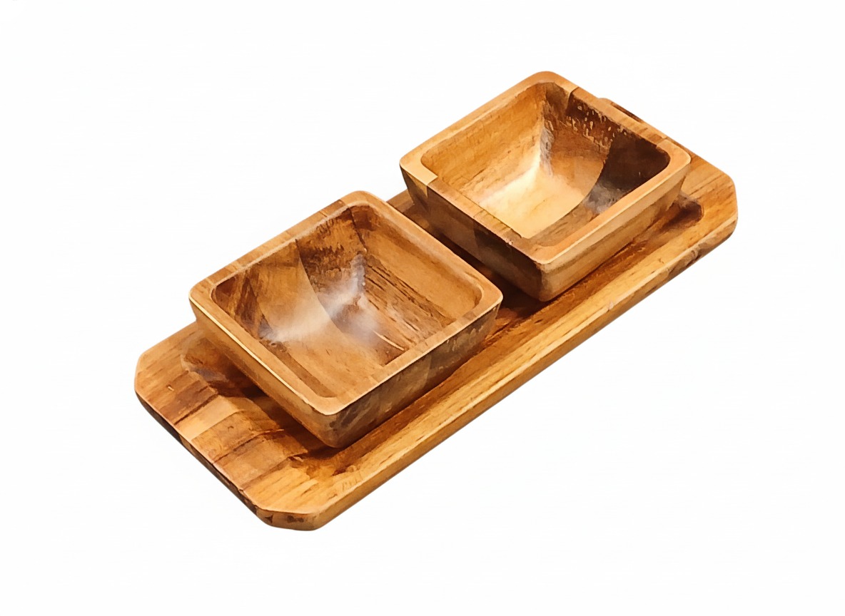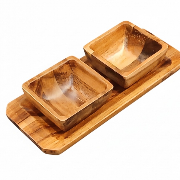 Discover this elegant wooden serving set, featuring a rectangular tray crafted from beautiful, natural wood, accompanied by two perfectly proportioned square bowls. Ideal for stylish entertaining, this versatile piece brings a touch of rustic charm and organic warmth to any table setting. Use it to present an array of appetizers, dips, nuts, or condiments, making it perfect for dinner parties, casual gatherings, or everyday dining. The rich wood grain and minimalist design ensure it complements both modern and traditional decor. Elevate your culinary presentation and impress your guests with this functional and aesthetically pleasing wooden serving solution, an essential addition for home chefs and entertainers alike.