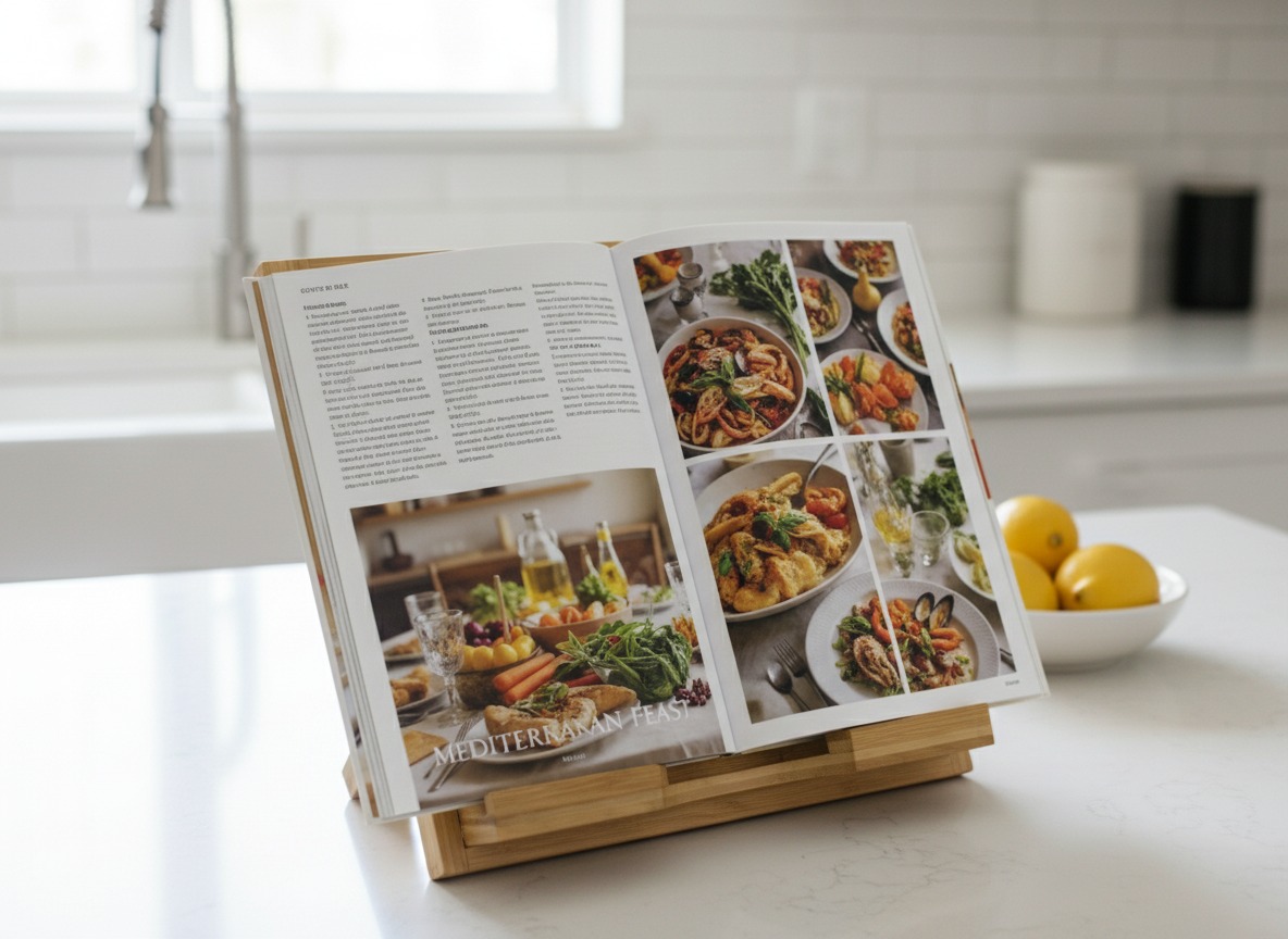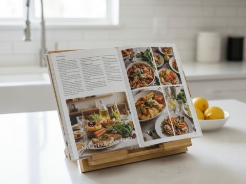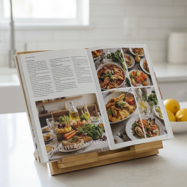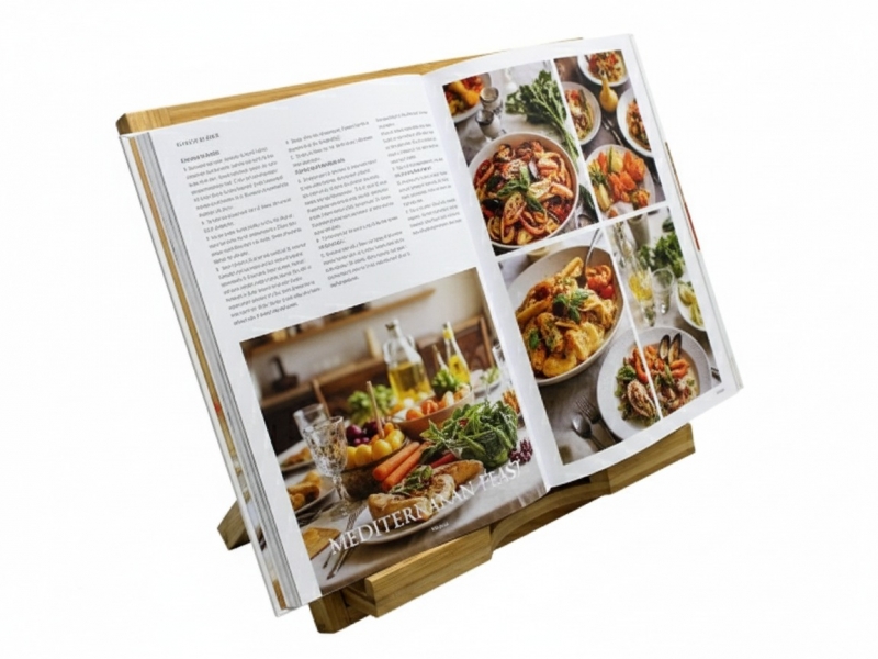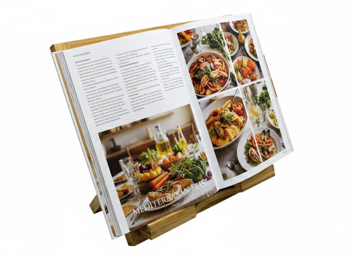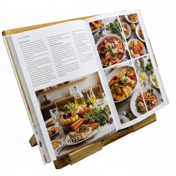 Showcasing a versatile and eco-friendly bamboo cookbook stand, this image captures the item from a dynamic, slightly angled perspective against a clean white background. Crafted from sustainably sourced bamboo, the stand features a slatted design on its adjustable backrest, providing optimal airflow and a modern aesthetic. Its sturdy construction ensures a reliable perch for cookbooks, tablets, or recipe cards, keeping them open and visible while cooking. The front lip holds items securely, preventing slips. Ideal for enhancing kitchen organization, this natural wood stand promotes hands-free reading, reducing clutter and improving ergonomic comfort. It’s a stylish and practical addition to any culinary space, perfect for home chefs seeking both functionality and sustainable design.