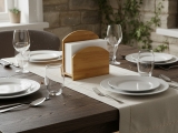 This elegant bamboo napkin holder offers a stylish and eco-friendly solution for organizing your dining table or kitchen counter. Crafted from natural, sustainable bamboo, its warm, light wood tone and distinctive grain add a touch of minimalist sophistication to any decor. The sturdy design features two compartments, making it versatile enough to hold napkins, letters, mail, or even small recipe cards, keeping them tidy and easily accessible. Its compact size ensures it fits perfectly in various settings, from casual family meals to more formal gatherings. Ideal for contemporary homes, this durable and aesthetically pleasing organizer combines practicality with a commitment to sustainable living, enhancing your space with natural beauty and effortless organization. Perfect for modern kitchens and dining areas.