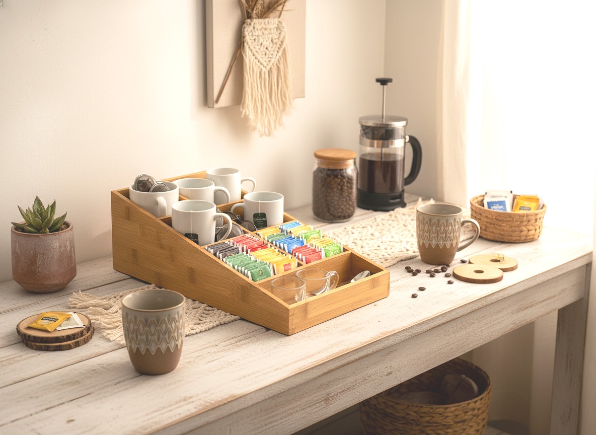 Be surprised by this versatile bamboo organizer, perfect for decluttering any space. Featuring multiple compartments, its natural wood finish brings an eco-friendly touch to your home or office. Ideal for organizing tea bags, coffee pods, office supplies, or craft essentials, this tiered storage solution offers easy access and visibility. Its compact and stylish design fits seamlessly on countertops, desks, or in breakrooms, promoting a tidy and aesthetically pleasing environment. Crafted from sustainable bamboo, it's a durable and practical choice for anyone seeking efficient and natural home organization solutions, appealing to conscious consumers in USA and European markets.