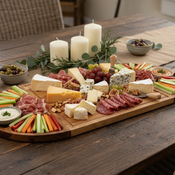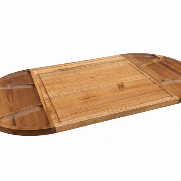 This beautifully crafted acacia wood platter offers both elegance and functionality for any home. Its distinctive oval shape features a large central cutting or serving area, perfectly framed by multiple carved compartments ideal for various accompaniments. The rich, warm tones and natural grain of the acacia wood make it a stylish addition to entertaining, perfect for showcasing charcuterie, cheeses, fruits, or appetizers. Designed for versatility, this durable wooden board is excellent for hosting dinner parties, casual gatherings, or as a sophisticated kitchen accessory. Its robust construction ensures long-lasting use, blending seamlessly with modern and rustic decor styles, making every serving experience a delightful one.