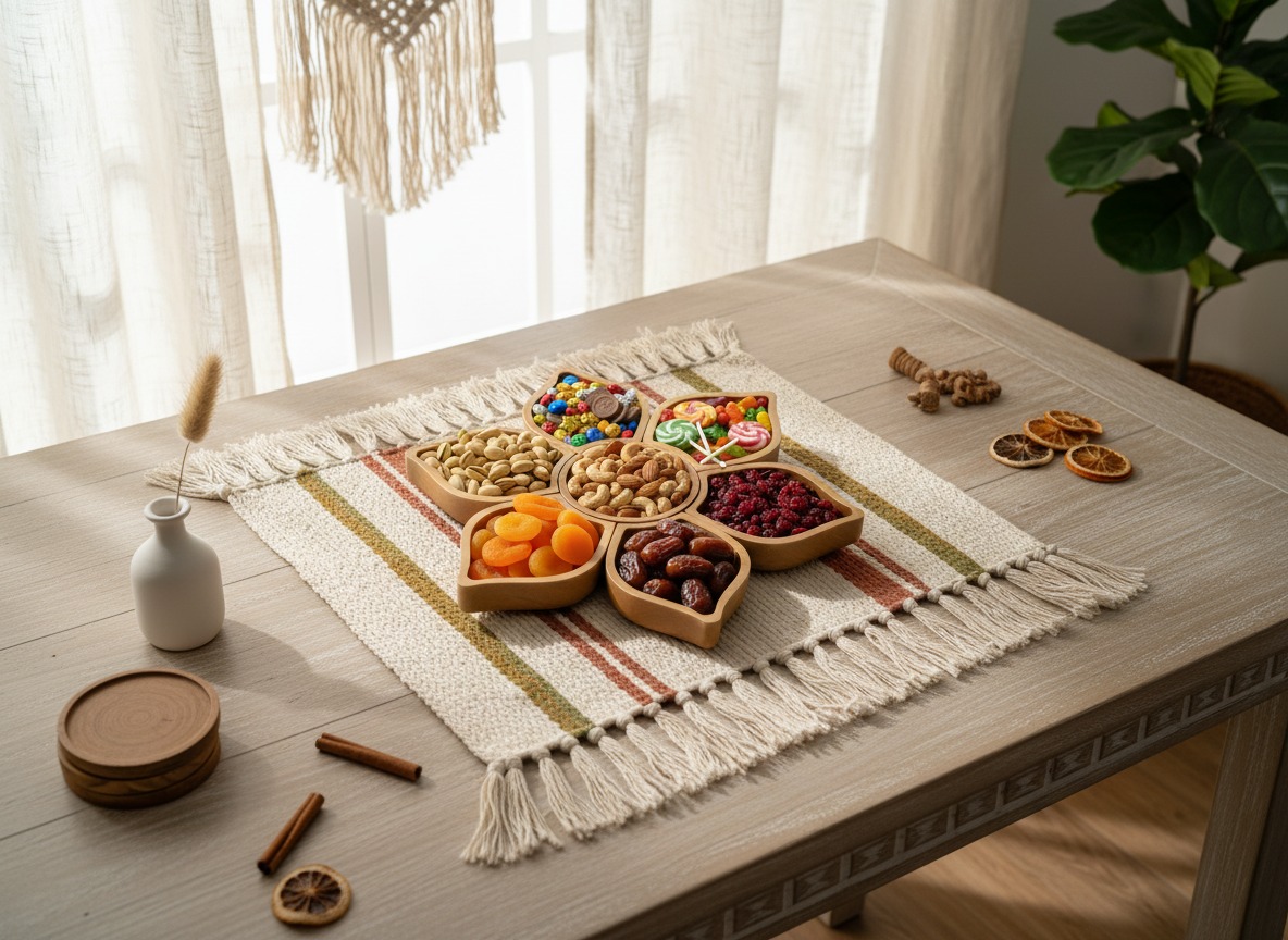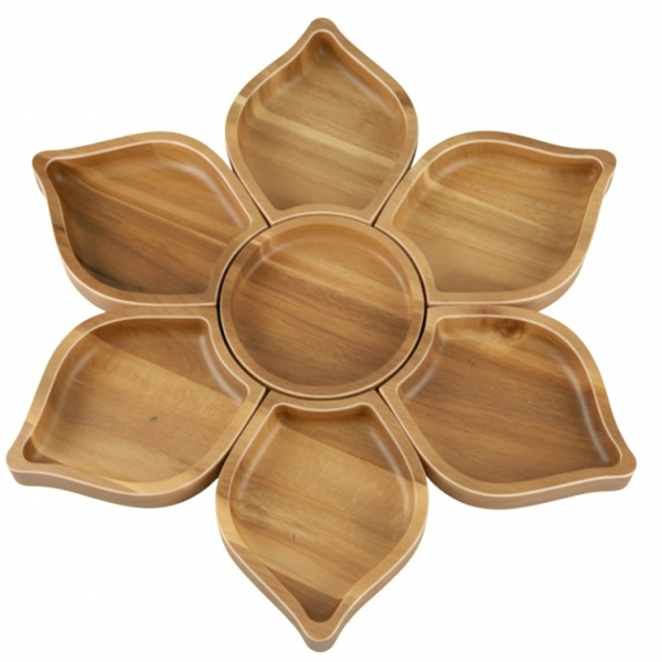 Bring home the timeless elegance of this exquisite flower-shaped acacia wood serving platter, designed to elevate your entertaining experience. Crafted from rich, natural acacia wood, this multi-compartment dish features a central circular section surrounded by six petal-like compartments, perfect for a diverse array of snacks and appetizers. Its beautiful grain and smooth finish bring a touch of rustic elegance and modern sophistication to any table setting, whether for casual gatherings or formal events. Ideal for serving nuts, dried fruits, cheeses, olives, or dips, this decorative and functional piece is a must-have for hosts looking to impress. The unique, nature-inspired design makes it a stunning centerpiece for your dining room, coffee table, or buffet spread. A truly versatile and stylish addition to your home decor and kitchenware collection.