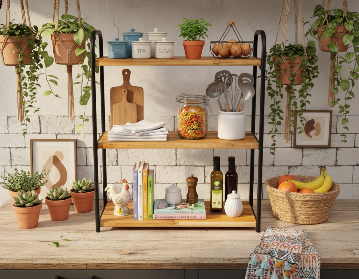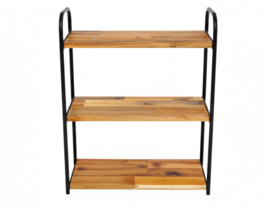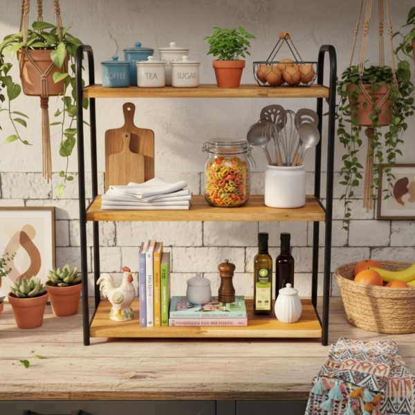 Discover this elegant and functional 3-tier acacia kitchen shelf, perfect for enhancing any home decor. Crafted with durable acacia wood shelves and a sleek black metal frame, this industrial-inspired unit offers versatile storage and display options. Its compact design makes it ideal for maximizing space in kitchens, pantries, or dining areas. Use it to organize spices, cookbooks, small appliances, or decorative items. The natural wood grain of the acacia adds a touch of rustic charm, while the sturdy metal ensures stability and longevity. An essential piece for modern farmhouse, minimalist, or industrial interiors, providing both style and practicality. Enhance your home with this chic storage solution.