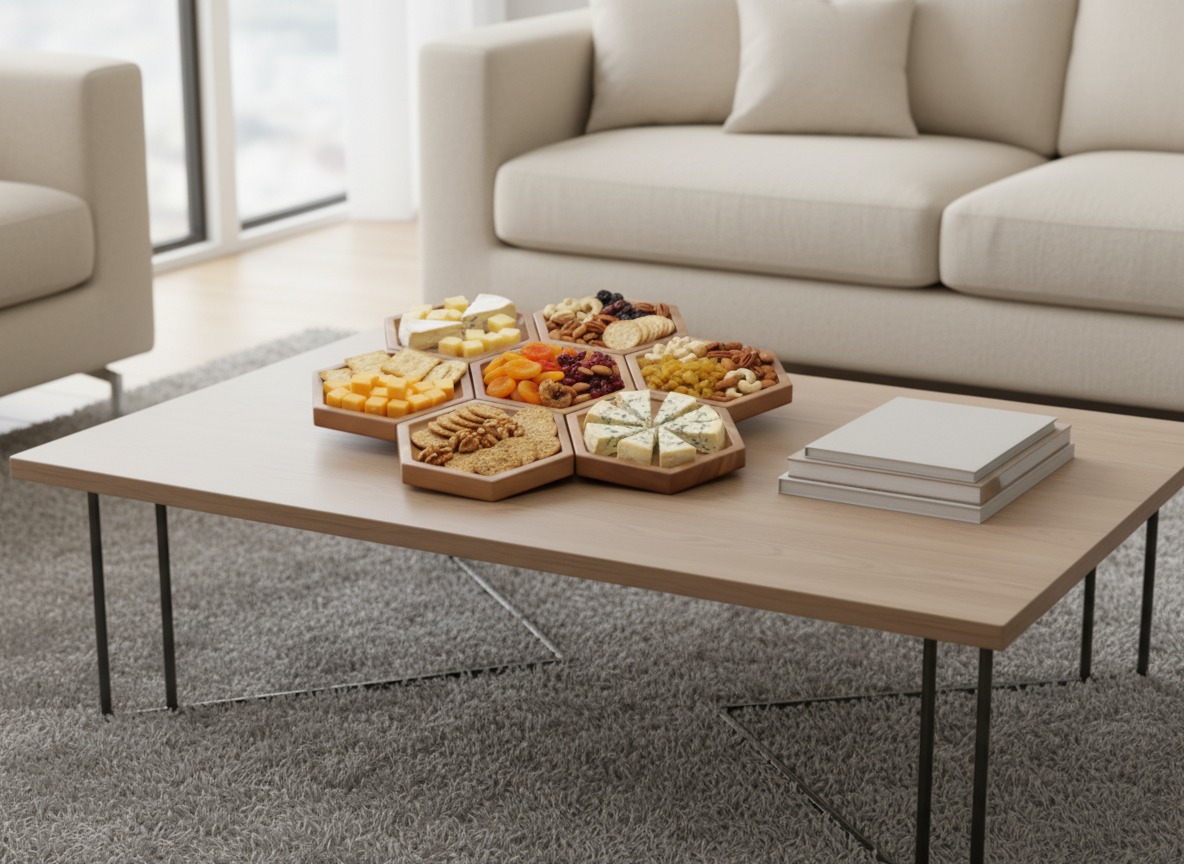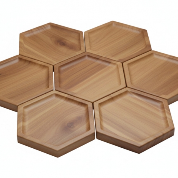 Discover this exquisite set of seven honeycomb-shaped acacia wood platters, perfect for elevating your home decor and serving needs. Each hexagonal tray showcases the natural beauty and rich grain of acacia wood, offering a warm, organic touch to any setting. Designed for versatility, these stylish wooden trays can be arranged together to create a striking centerpiece or used individually for serving appetizers, desserts, or small bites. Their unique interlocking design allows for creative configurations, making them ideal as decorative organizers for keys, jewelry, or office supplies. Enhance your dining experience, add a touch of rustic elegance to your living space, or present your culinary creations with these versatile and eco-friendly serving pieces. A must-have for modern homes and conscious living.