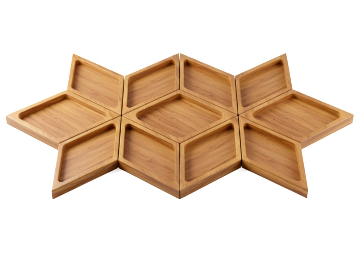 Showcasing a beautifully crafted modular serving set made from rich acacia wood, this image captures the elegance and versatility of contemporary home decor. The individual rhombus-shaped trays can be arranged in various configurations, forming a stunning hexagonal pattern or a star-like display, perfect for entertaining or daily use. Each piece highlights the natural grain and warm tones of the acacia, offering both functionality and aesthetic appeal. This eco-friendly and durable wooden set is ideal for serving snacks, appetizers, or as a sophisticated organizational solution for small items. Its unique design makes it a focal point in any room, blending modern design with natural materials for a stylish touch.