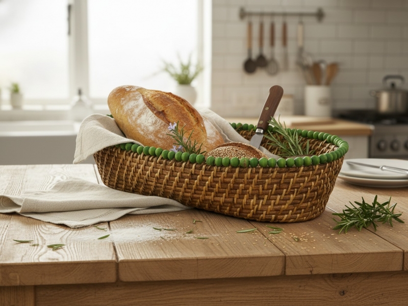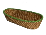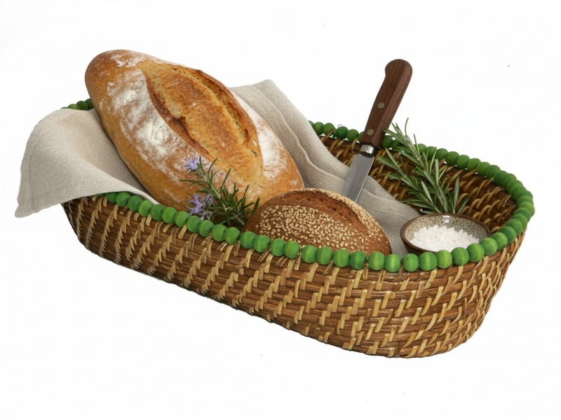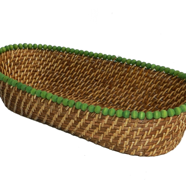 The Oval rattan bread basket with wooden beads is a charming addition to any kitchen or dining table. Handcrafted with care, this rustic-inspired basket exudes natural beauty and timeless appeal. The intricate weaving of rattan creates a sturdy yet flexible structure, perfect for holding and displaying an assortment of bread or rolls. The addition of wooden beads along the edges adds an elegant touch, enhancing the overall aesthetic. This versatile basket is not only functional but also serves as a decorative piece, elevating the presentation of your baked goods. Bring warmth and a touch of rustic elegance to your table with this exquisite bread basket.
