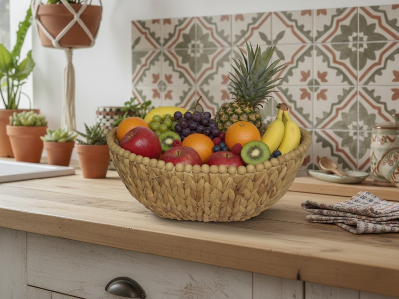 Unveil the delightful beauty inherent in this beautifully crafted oval water hyacinth bowl, perfect for adding a touch of natural elegance to any home decor. Hand-woven with sustainable water hyacinth, its textured surface and organic appeal create a warm, inviting atmosphere. The rim is delicately adorned with a line of smooth wooden beads, enhancing its bohemian and rustic charm. This versatile decorative bowl serves as an eye-catching centerpiece for tables, a functional storage solution for everyday items, or a stylish accent piece on shelves. Its unique oval shape and earthy tones blend seamlessly with various interior styles, from farmhouse to coastal and minimalist. Ideal for enhancing living rooms, dining areas, or entryways, this eco-friendly basket combines utility with sophisticated design.