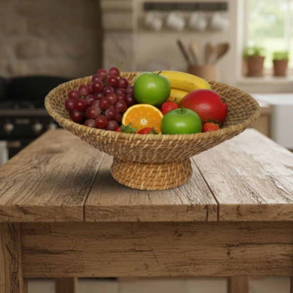 Discover the rustic elegance of this beautifully crafted rattan footed bowl, an ideal addition to any contemporary or bohemian home decor. Handmade from natural rattan, this versatile bowl features a finely woven texture and a subtle pedestal base, elevating its aesthetic appeal. Perfect for adding a touch of organic warmth to your living space, it serves as both a functional storage solution and a charming decorative accent. Its neutral, earthy tones blend seamlessly with various interior styles, from minimalist to farmhouse. Utilize this footed bowl to display fresh fruits, hold potpourri, organize small essentials, or simply as a striking standalone art piece. A sustainable choice for conscious consumers, this rattan bowl embodies artisanal craftsmanship and timeless design, making it a stylish and eco-friendly statement for any room.