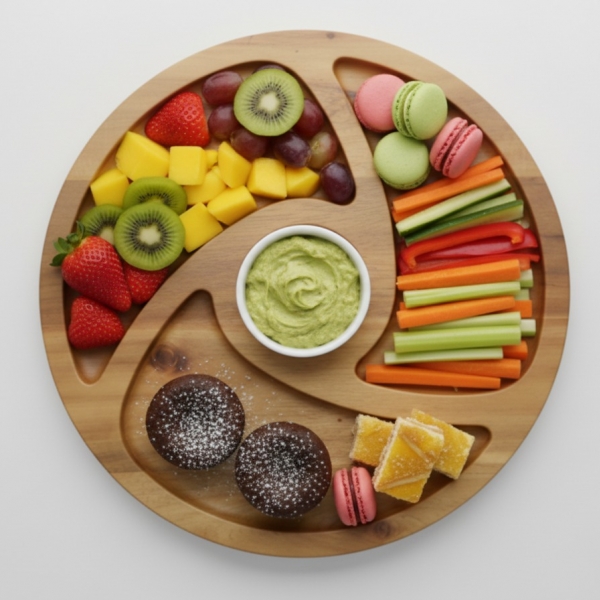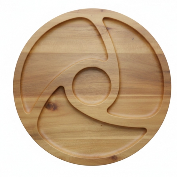 Immerse yourself in the sleek design of this round acacia wood serving platter, perfect for elevating any dining or entertaining experience. This elegantly designed sectional tray features a unique three-compartment layout around a central circular dip holder, making it ideal for presenting a variety of appetizers, cheeses, charcuterie, or snacks. Crafted from durable and sustainably sourced acacia wood, its natural grain patterns add a touch of warmth and sophistication to any table setting. Whether hosting a casual gathering or a formal dinner, this versatile wooden platter provides a stylish and functional solution for food presentation. Its smooth finish and ergonomic design ensure easy handling and cleaning, making it a must-have accessory for modern kitchens and homes across both USA and European markets. Enhance your culinary displays with this timeless piece.