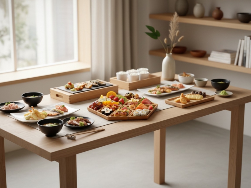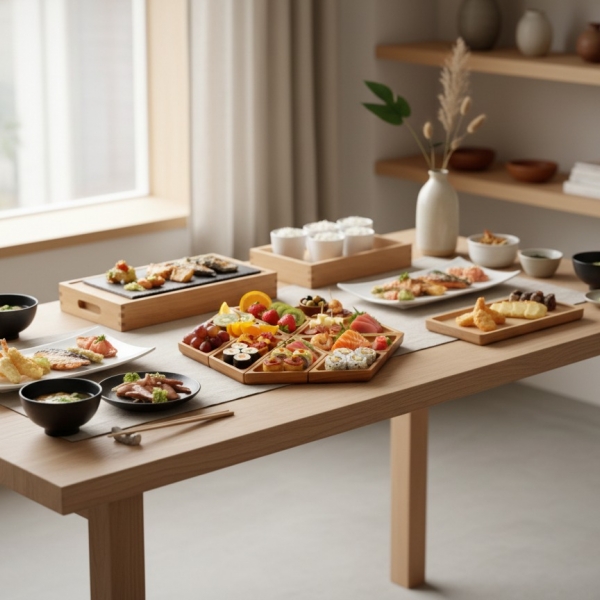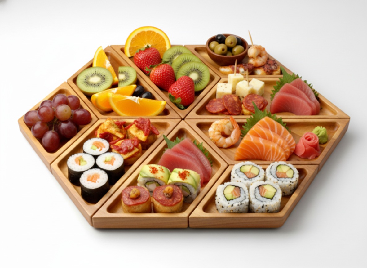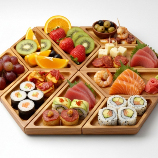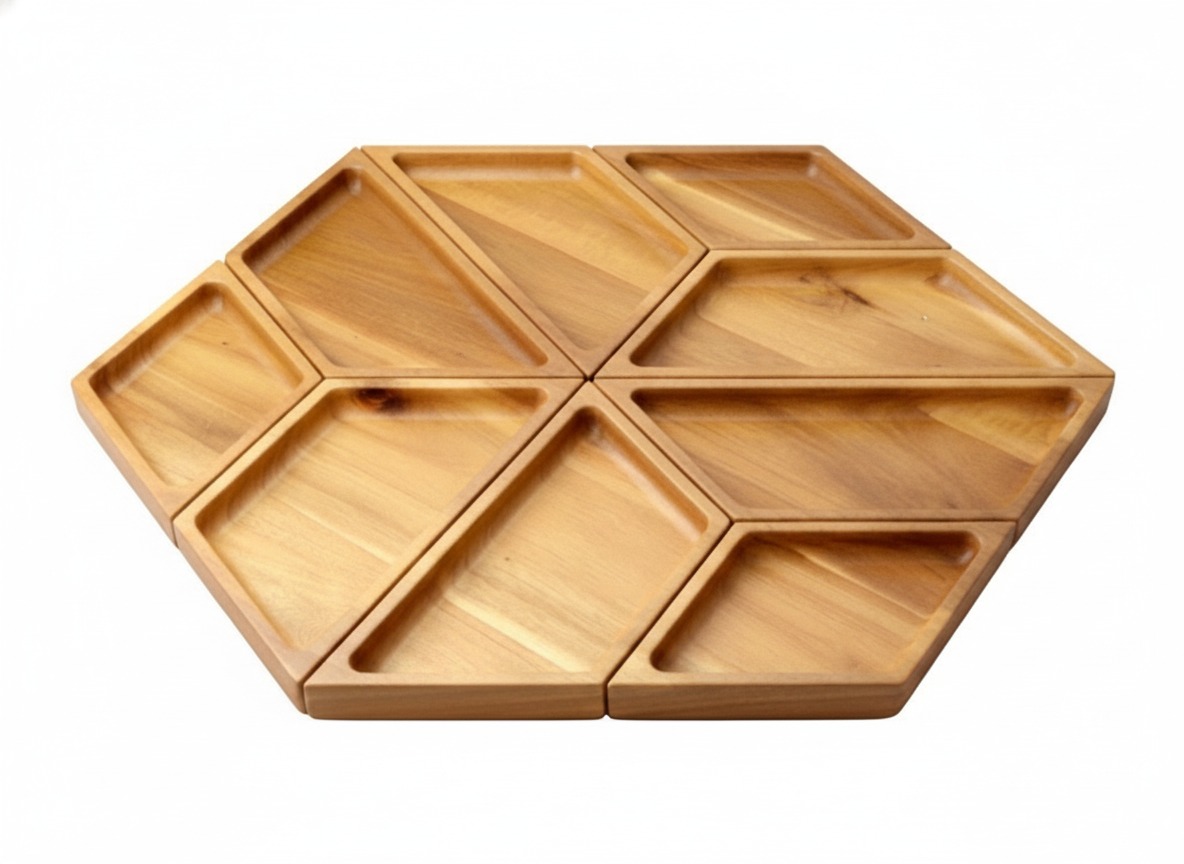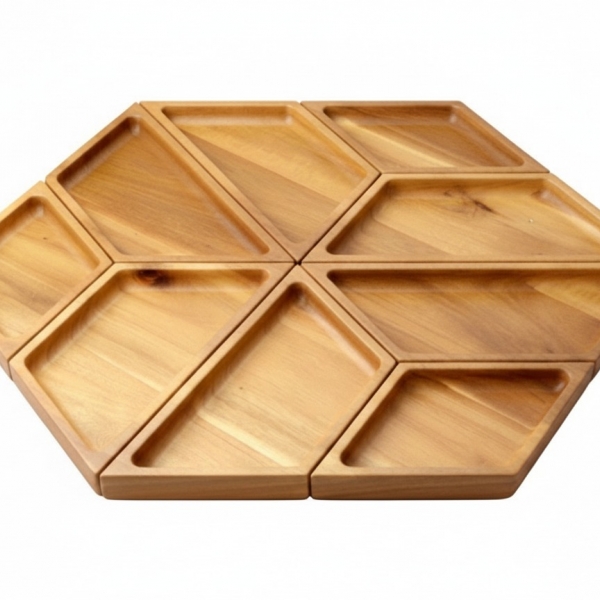 This unique wooden serving platter, crafted from rich, light-toned wood, presents a modern and modular design. Arranged in a captivating hexagonal pattern, it features multiple interlocking compartments of varying triangular and trapezoidal shapes, perfect for organizing an assortment of snacks, appetizers, or condiments. Each section is smoothly finished, highlighting the natural wood grain and offering a sophisticated aesthetic that complements any contemporary decor. Ideal for entertaining guests or simply adding a touch of elegant organization to your table, this versatile piece blends functionality with minimalist style. Its distinctive design makes it a focal point, whether used for a cheese board, a selection of tapas, or a candy dish. This beautiful and practical item is a must-have for stylish home entertaining.