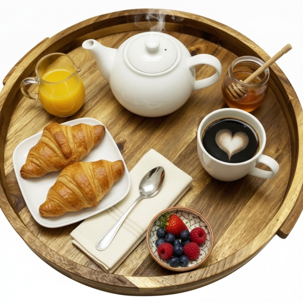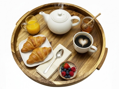 Capture the essence of a perfect morning with this inviting breakfast spread artfully arranged on a warm, rustic wooden tray. Two perfectly golden, flaky croissants rest on a crisp white plate, promising a delicious start to the day. Beside them, a steaming white teapot suggests freshly brewed tea, complementing the dark, rich coffee in a matching white cup, adorned with charming heart-shaped latte art. A vibrant pitcher of fresh orange juice adds a pop of color and essential vitamins, while a small jar of golden honey with its wooden dipper offers natural sweetness. Completing this delightful ensemble is a bowl overflowing with an assortment of luscious, ripe berries – plump blueberries, juicy raspberries, and a bright red strawberry – providing a burst of freshness. This gourmet spread evokes feelings of comfort, indulgence, and a tranquil start, ideal for a luxurious breakfast in bed or a relaxing weekend morning.