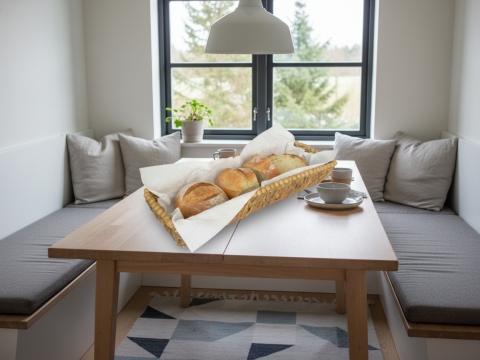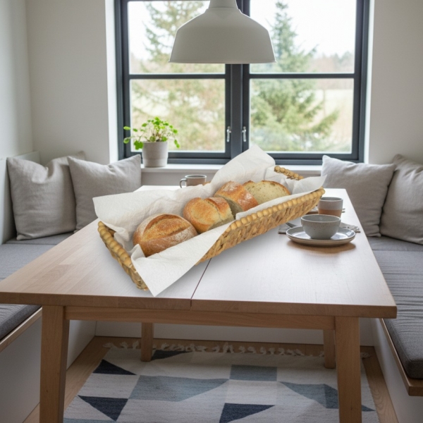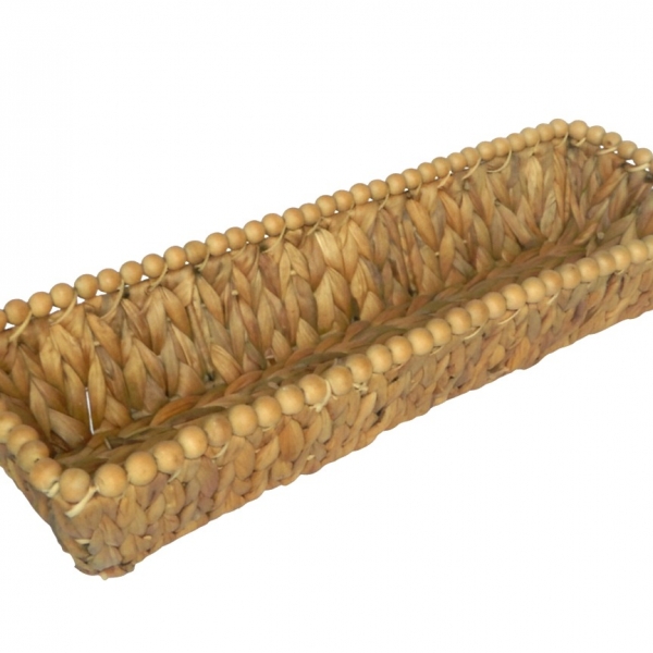 A beautifully crafted rectangular water hyacinth bread basket, perfect for adding a touch of natural elegance to any kitchen or dining setting. This versatile serving piece features a meticulously woven texture, showcasing the rich, earthy tones of natural fibers. The design is enhanced by a charming row of light-toned wooden beads meticulously integrated along the rim, offering a rustic yet sophisticated aesthetic. Ideal for serving artisan breads, rolls, or pastries, its elongated shape also makes it suitable for displaying decorative items, holding mail, or organizing small household essentials. This eco-friendly and stylish basket is a must-have for those seeking functional decor that blends seamlessly with various interior design styles, from bohemian to modern farmhouse. Its durable construction ensures long-lasting use, making it a practical and attractive addition to your home.