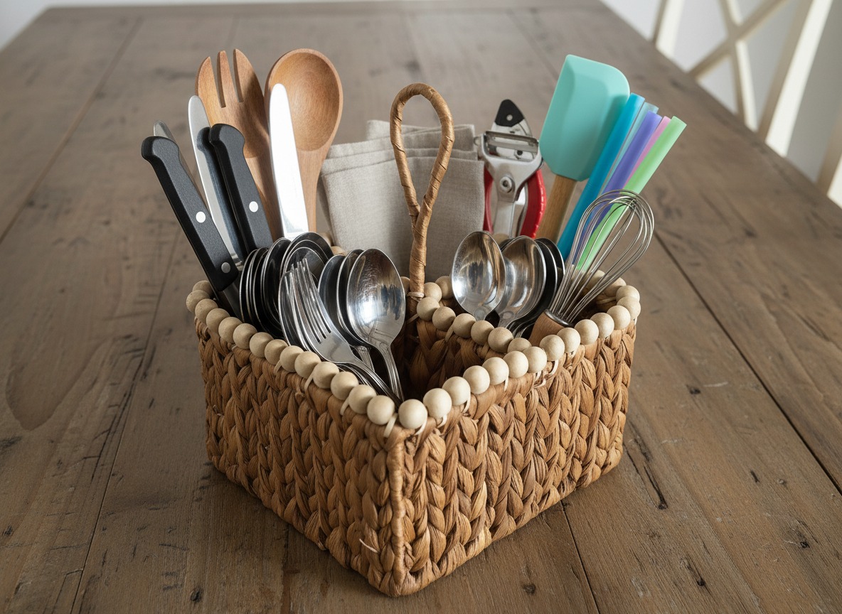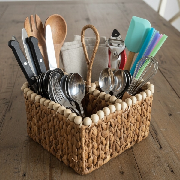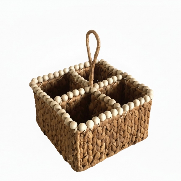 The Square Water Hyacinth Flatware Caddy with Wooden Beads is a stunning addition to any dining table or kitchen counter. Made from natural water hyacinth, this caddy brings an organic touch to your space. The white washed finish adds a touch of elegance and complements a variety of decor styles. The square shape provides ample space for holding flatware, napkins, or other kitchen essentials. The wooden bead accents on the sides add a charming detail to the caddy. Not only is this caddy functional, but it also adds a rustic and coastal vibe to your dining experience.