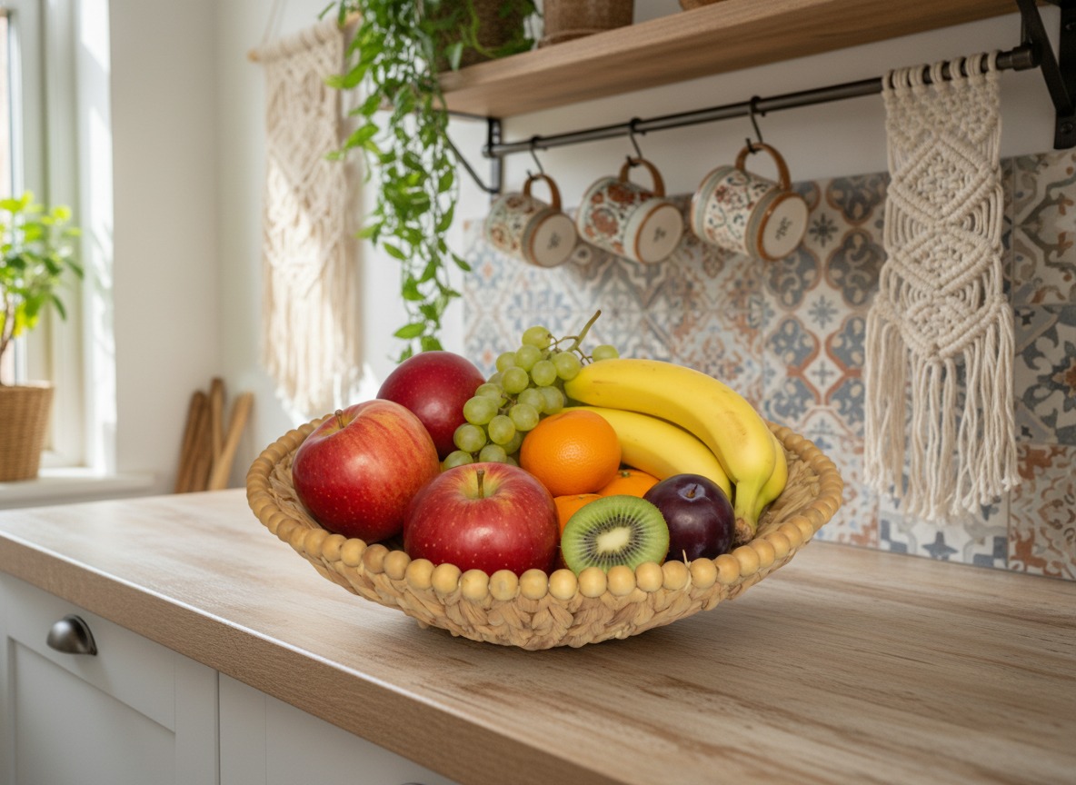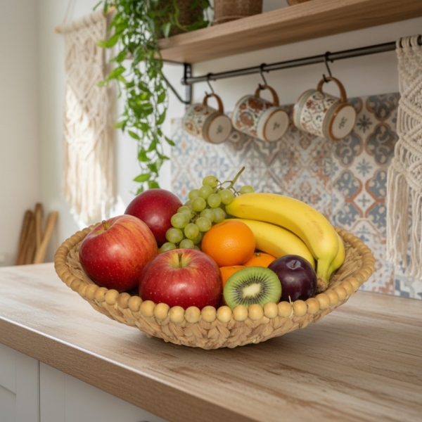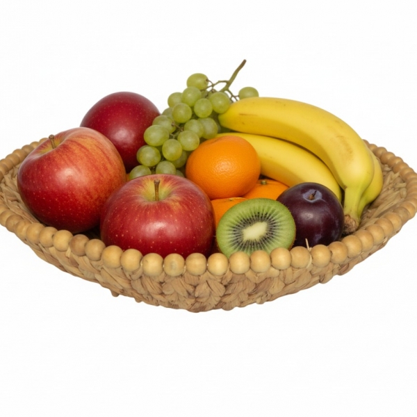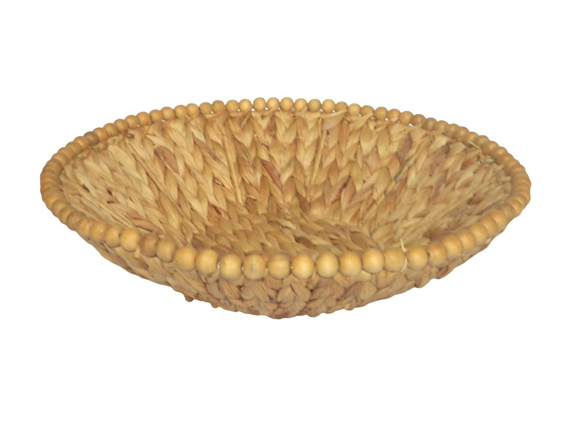 Elevate your home decor with this beautifully crafted round water hyacinth bowl, featuring a distinctive woven texture and a charming wooden beaded rim. This versatile shallow bowl, made from sustainable natural fibers, brings a touch of rustic elegance and bohemian flair to any space. Perfect for adding organic warmth, it serves as an exquisite decorative accent or a functional storage solution. Its neutral tones seamlessly blend with various interior styles, from farmhouse chic to coastal retreat. Ideal for tabletops, shelves, or counters, this durable and stylish piece offers both aesthetic appeal and practical utility, making it a must-have for curated living.