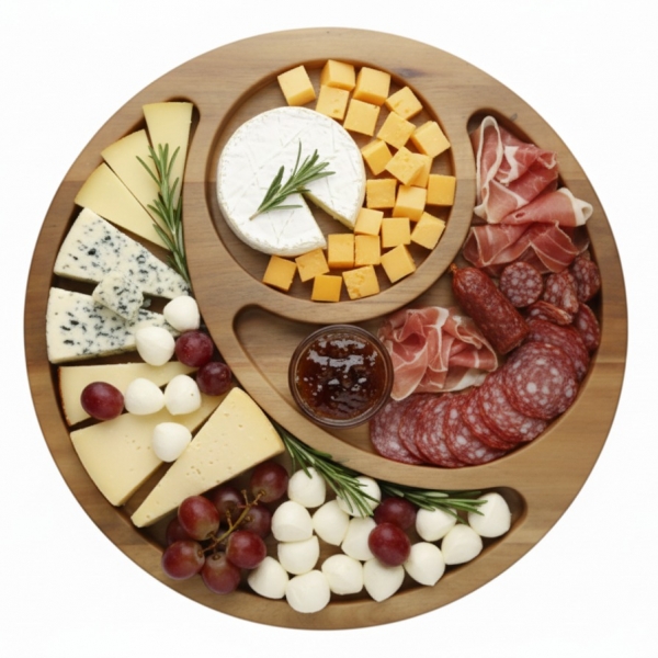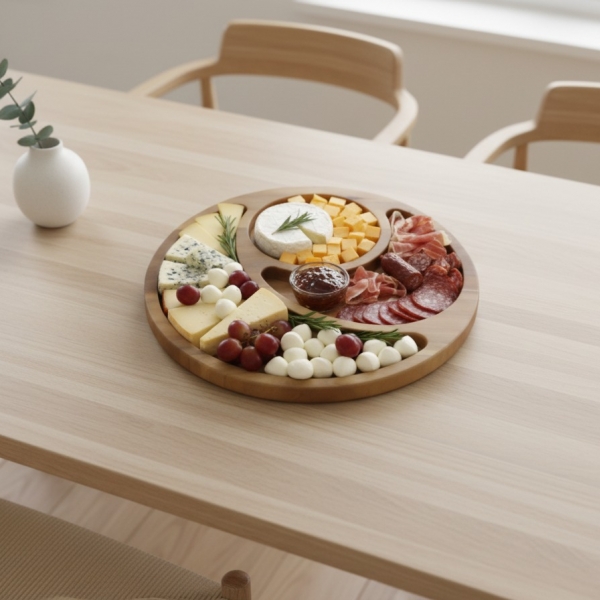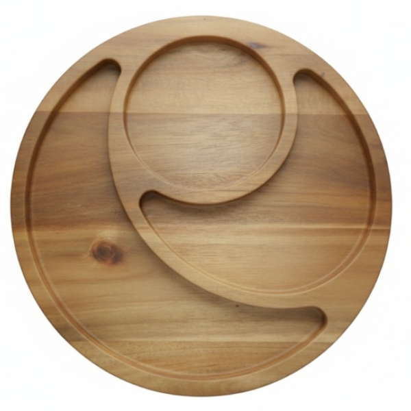 Behold the stunning craftsmanship of this round acacia platter, perfect for enhancing your entertaining experience. Featuring a beautiful natural wood grain, this versatile serving tray is designed with multiple distinct compartments, ideal for presenting an assortment of appetizers, snacks, or charcuterie. Its smooth, polished surface and thoughtful design make it a stylish addition to any kitchen or dining room decor. Whether you're hosting a dinner party, a casual gathering, or simply enjoying a quiet evening at home, this durable acacia wood board offers both functionality and aesthetic appeal. It's an excellent choice for cheese, crackers, fruits, nuts, and dips, bringing a touch of organic warmth to your table setting. Elevate your culinary presentation with this timeless and practical piece.