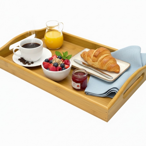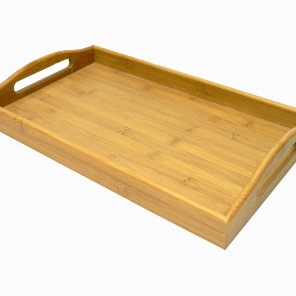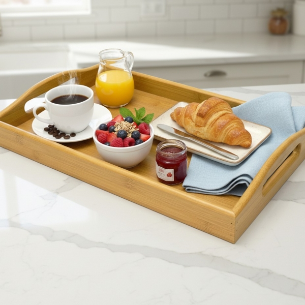 Elevate your home decor and serving experience with this beautifully crafted rectangular bamboo serving tray. Featuring a smooth, light brown finish that highlights the natural grain of the bamboo, this tray exudes a modern yet rustic charm. Its sturdy construction and integrated cut-out handles provide both durability and convenience, making it ideal for carrying breakfast in bed, serving beverages, or organizing essentials on a coffee table or ottoman. This versatile tray is not only a functional kitchenware item but also an elegant decorative piece for any living space. Perfect for those seeking sustainable and eco-friendly home accessories, it effortlessly blends style with practicality. Add a touch of natural elegance to your entertaining or daily routine with this chic bamboo design.