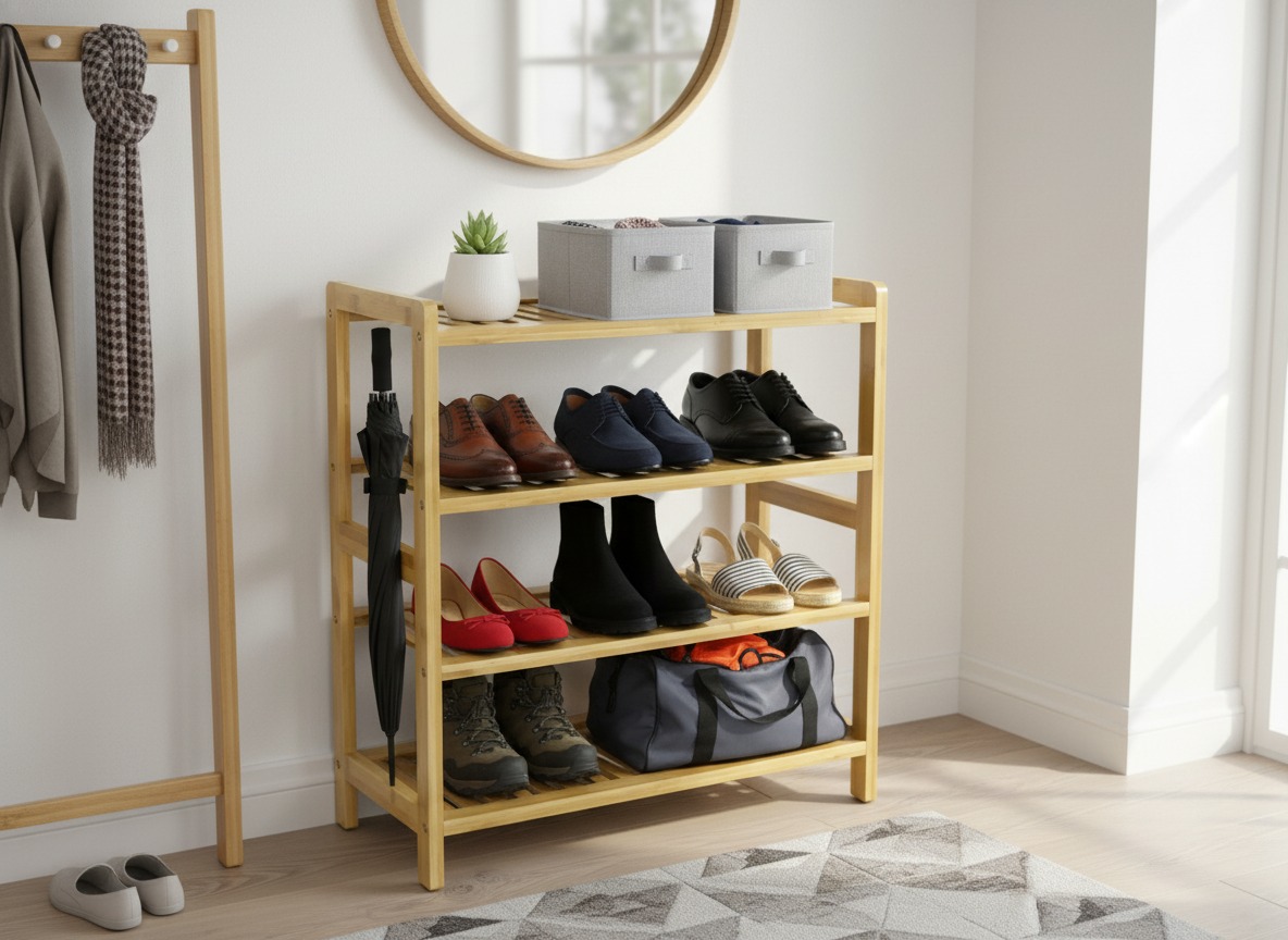 The 4-tier bamboo shoe rack is a versatile and eco-friendly storage solution for organizing your footwear. Crafted from sustainable bamboo, this stylish rack offers durability and a natural aesthetic appeal. With four spacious shelves, it can accommodate a significant number of shoes, keeping them neatly arranged and easily accessible. The open design allows for proper air circulation, preventing odors and promoting shoe freshness. Its compact size makes it ideal for small spaces like entryways or closets. Assembly is a breeze, and the sturdy construction ensures stability. The bamboo shoe rack is not only functional but also adds a touch of elegance to any room.