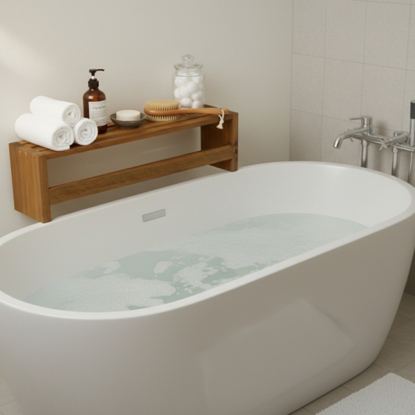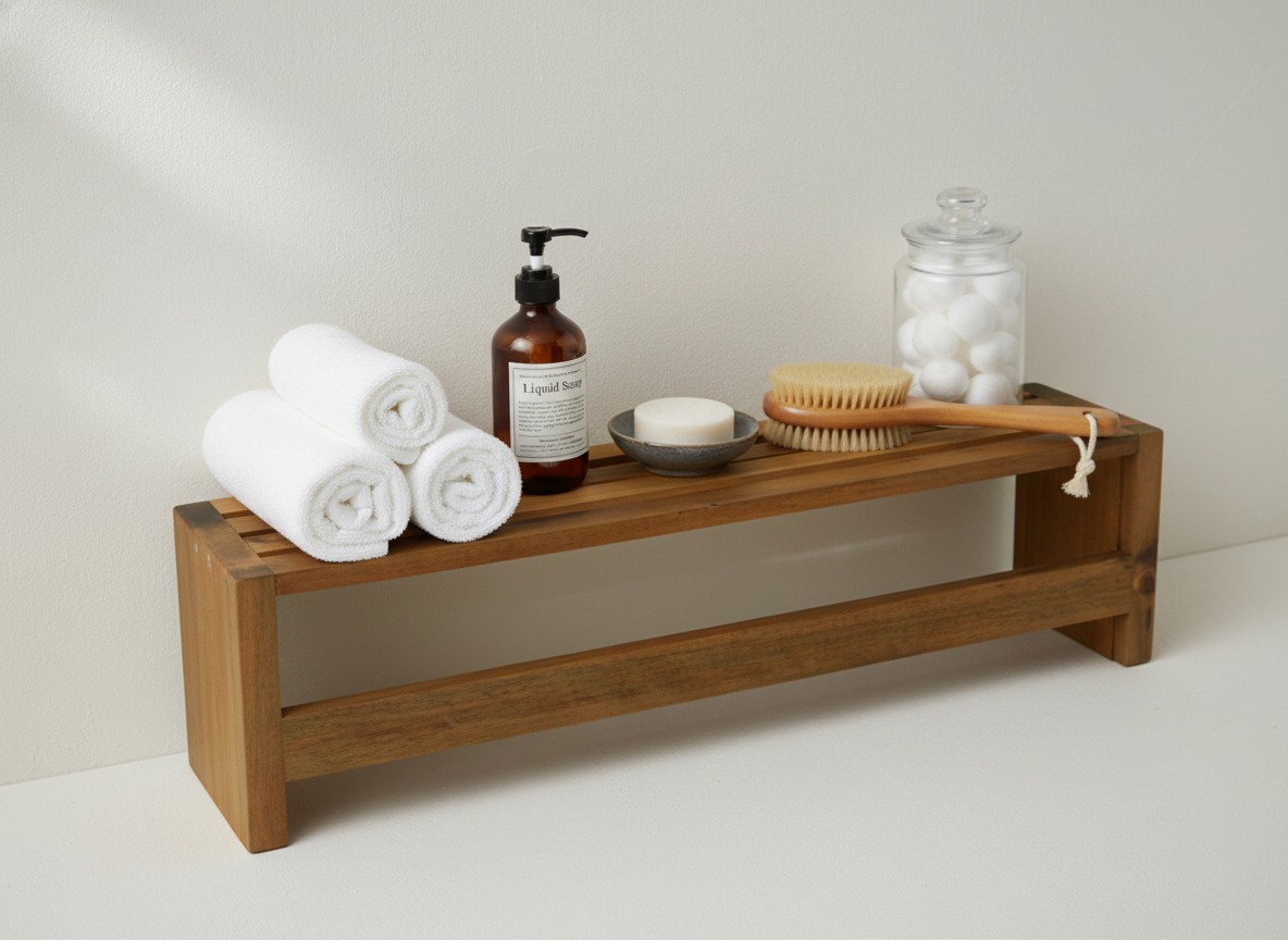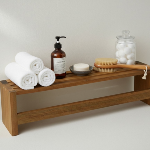 Discover the elegance and functionality of this minimalist Acacia wood bath shelf, perfect for enhancing your bathroom's decor and organization. Crafted from durable, water-resistant Acacia wood, this versatile shelf offers a stylish solution for storing essentials. Its slatted design ensures proper drainage and ventilation, making it ideal for wet environments. Whether used as a shower caddy to hold soaps and shampoos, a towel rack, or a decorative bench, its natural wood finish brings a spa-like tranquility to any space. This robust and eco-friendly piece is designed for both aesthetic appeal and practical everyday use, seamlessly blending with modern or traditional bathroom interiors. Elevate your bathroom experience with this durable and beautiful wooden accessory, a must-have for a tidy and sophisticated sanctuary.
