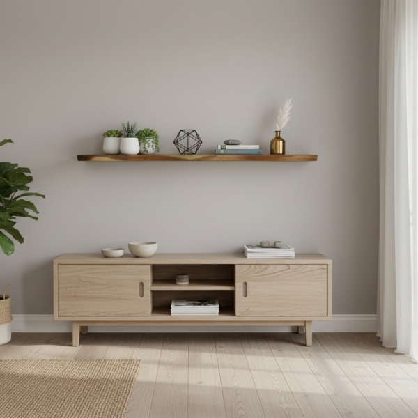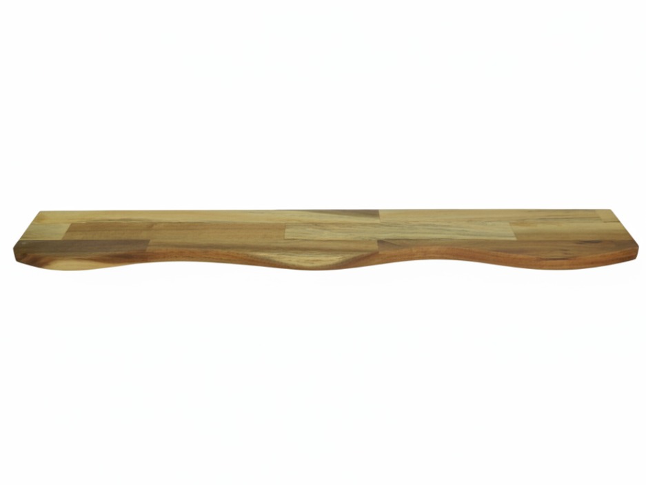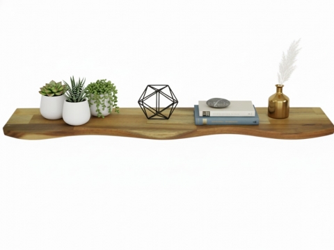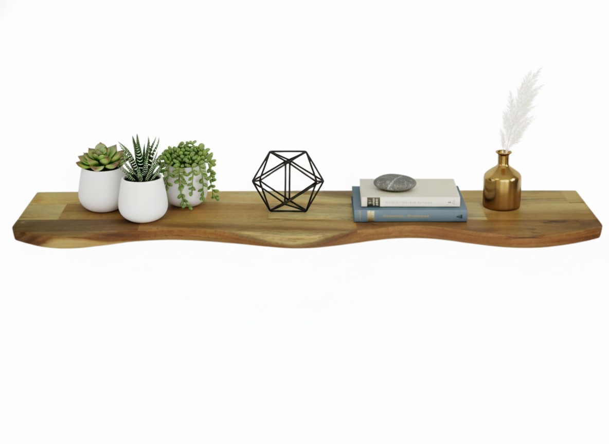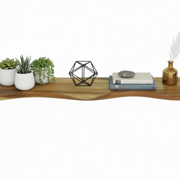Unfold the elegant appeal of this curvy acacia floating shelf, a perfect blend of natural beauty and modern design. Crafted from rich, variegated acacia wood, this shelf features a distinctive wavy front edge that adds a unique organic touch to any room. Its hidden mounting system creates a seamless, 'floating' effect, ideal for contemporary and minimalist interiors. Perfect for displaying cherished decorative items, small plants, books, or art, it enhances wall space without clutter. This versatile piece offers both functional storage and sophisticated aesthetic appeal, making it an excellent addition to living rooms, bedrooms, or hallways. Elevate your home decor with this stylish and durable acacia wood shelf, a truly eye-catching accent.