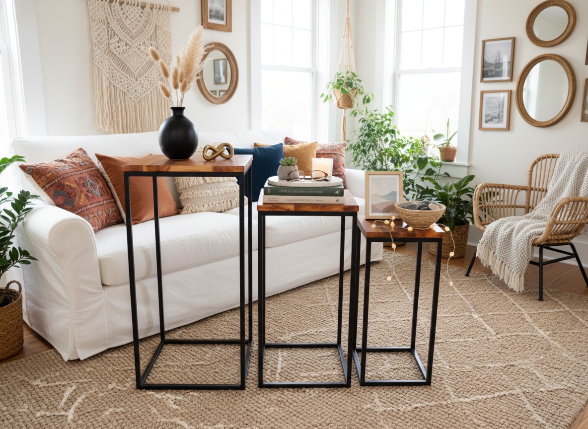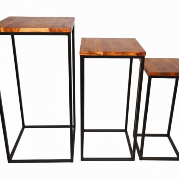 Impressed with this elegant set of three acacia side tables, perfect for modern living spaces. Each table features a sturdy, rich brown acacia wood top, beautifully contrasted with sleek, black powder-coated metal frames. The nesting design allows for versatile use, whether as individual display stands, practical bedside tables, or an adaptable coffee table arrangement. Their minimalist industrial aesthetic seamlessly complements various interior decors, from contemporary to rustic chic. Ideal for displaying plants, books, or decorative accents, these accent tables offer both style and functionality, making them a superb addition to any home, office, or retail environment. Enhance your decor with these trending, space-saving pieces.