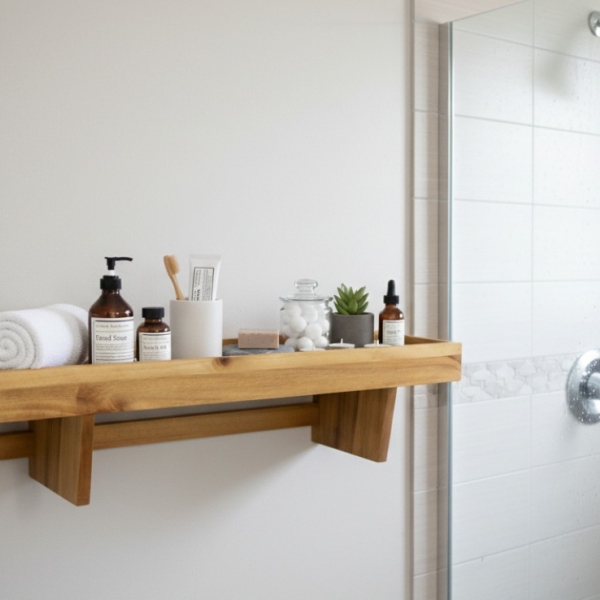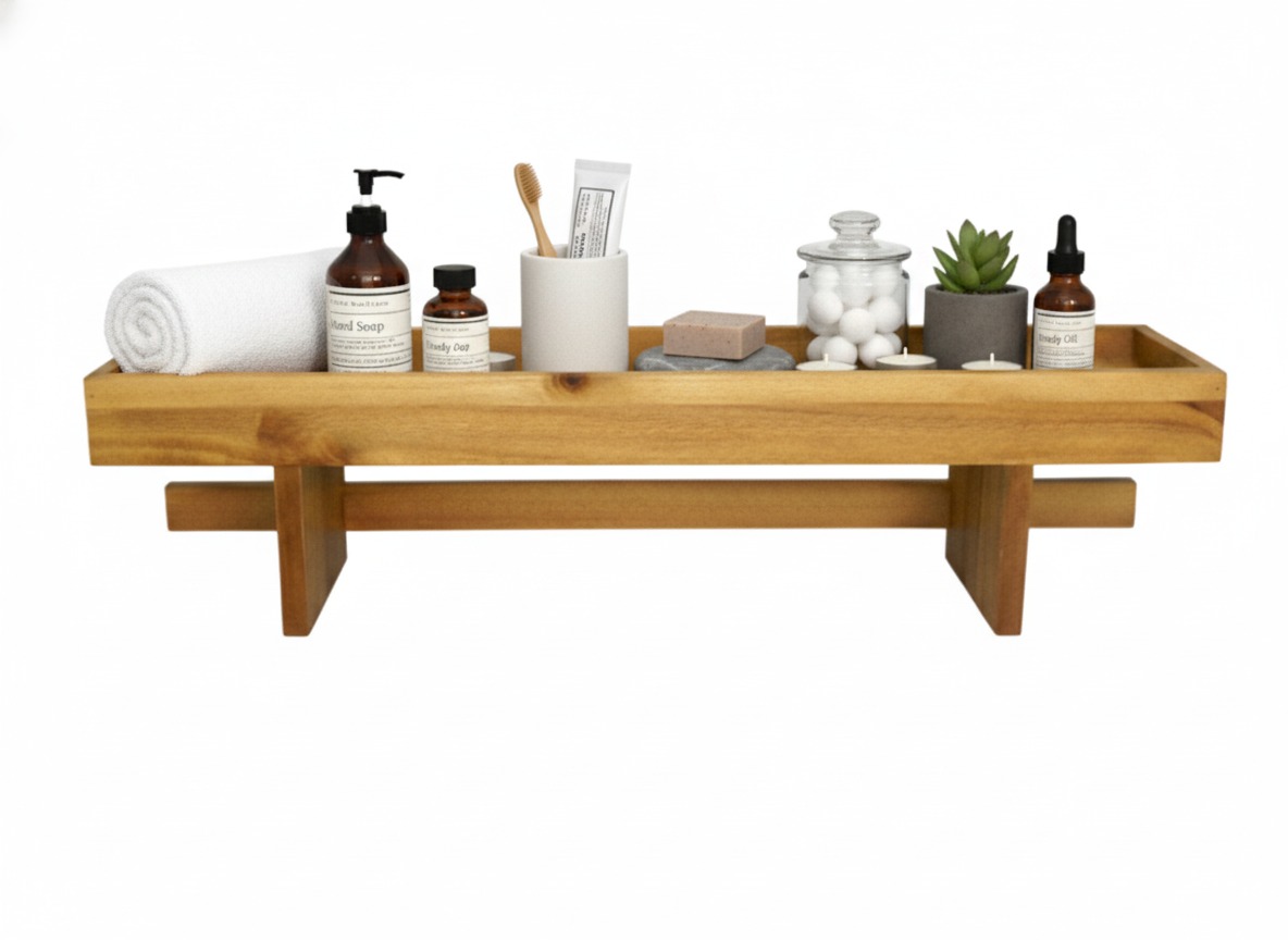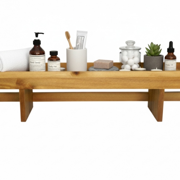 Be excited by this elegant acacia wood bath shelf, designed to elevate your bathroom into a serene spa oasis. Crafted from beautiful acacia wood, this rectangular caddy features a rich, natural grain and a sturdy, elevated design. It's perfectly sized to hold all your bathing essentials, from luxurious bath bombs and scented candles to a good book or a glass of wine. This versatile and durable accessory is ideal for anyone seeking to enhance their self-care routine with sustainable and stylish organization. Its minimalist aesthetic complements a wide range of decor styles, adding a touch of natural warmth and sophistication to any modern or rustic bathroom setting. A truly essential piece for a relaxing and organized bathing experience.