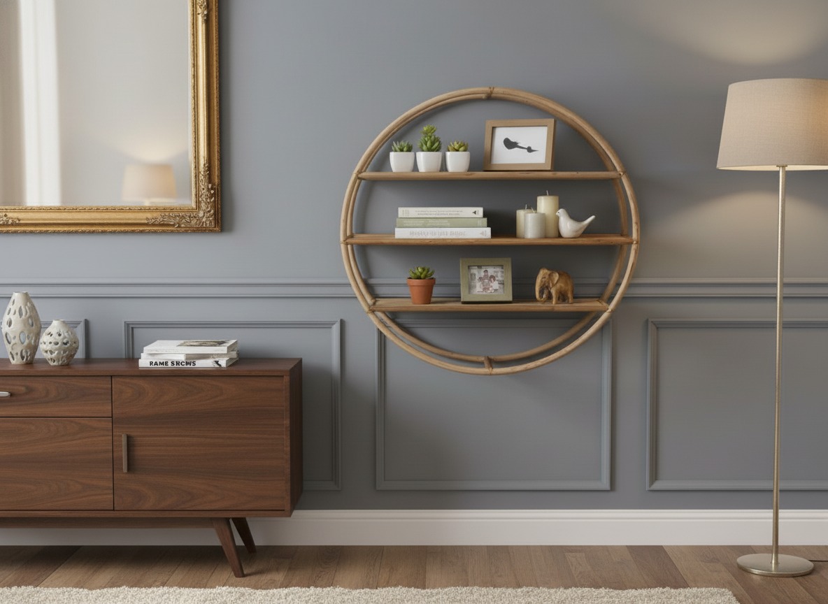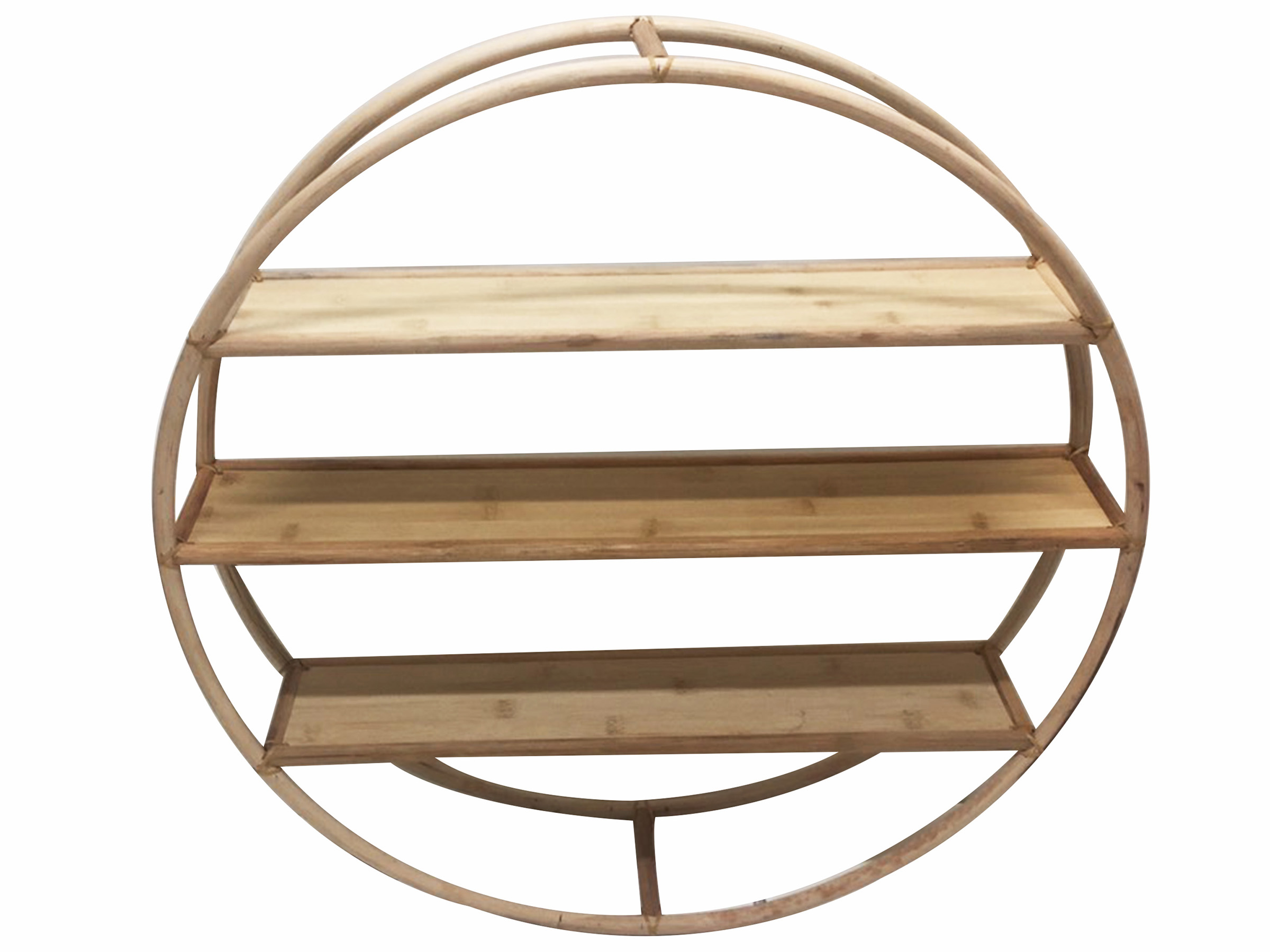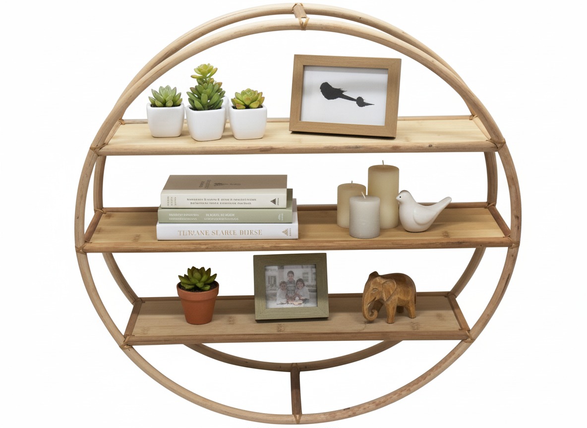 Discover this elegantly crafted circular rattan wall shelf, a perfect blend of natural aesthetics and practical storage. Featuring three sturdy, flat shelves within its charming round frame, this piece offers ample space to display your favorite decor, small plants, or books. The light, natural wood tones and bohemian design make it an ideal accent for any room, from living areas to bedrooms or even bathrooms. Its unique round shape adds a touch of organic modern style, enhancing both contemporary and rustic interiors. Easily mountable, this decorative and functional shelving unit is perfect for organizing and showcasing your personal touches while adding warmth and texture to your walls. A stylish solution for minimalist and boho-chic homes.